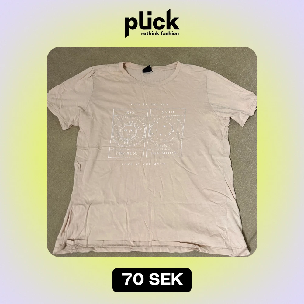 Säljer en beige t-shirt från Gina Tricot i storlek M. Den har ett tryck med solen och månen på framsidan. Perfekt för en avslappnad stil. T-shirten är kortärmad och gjord i mjukt material.