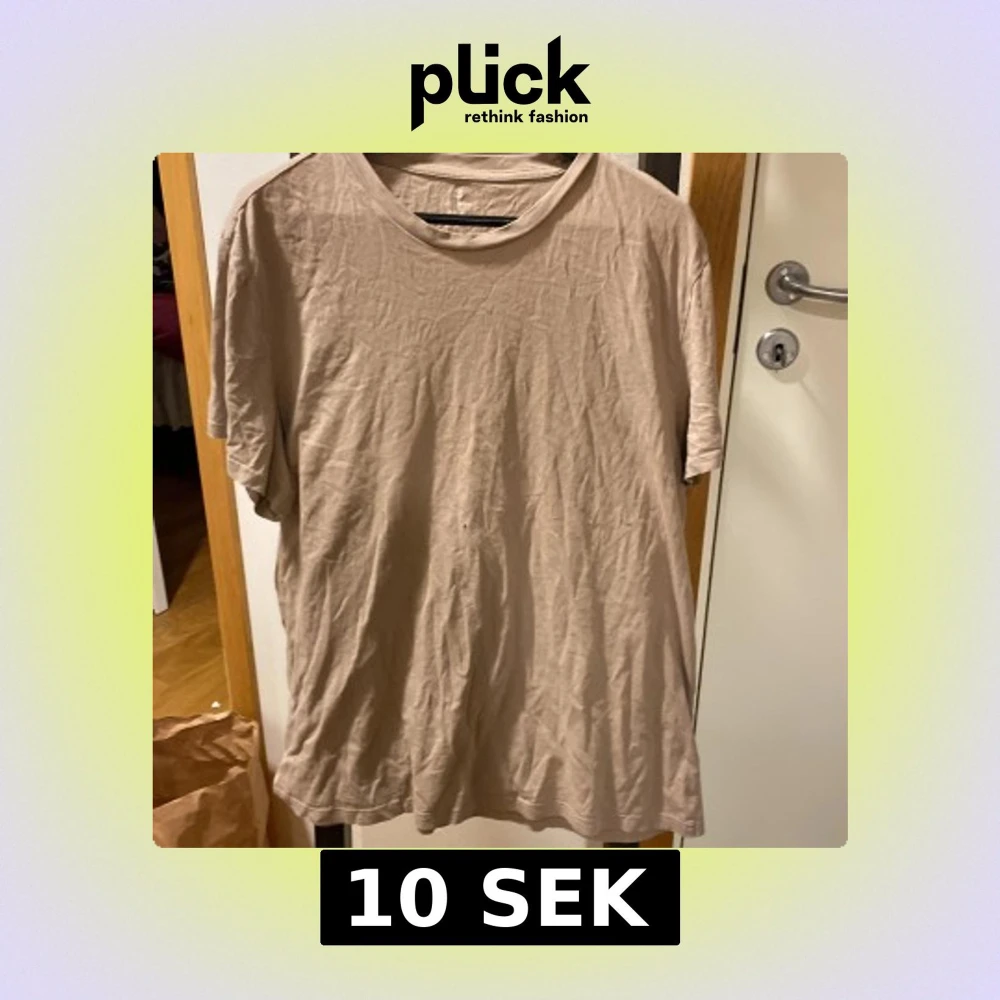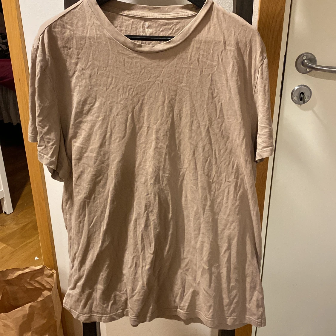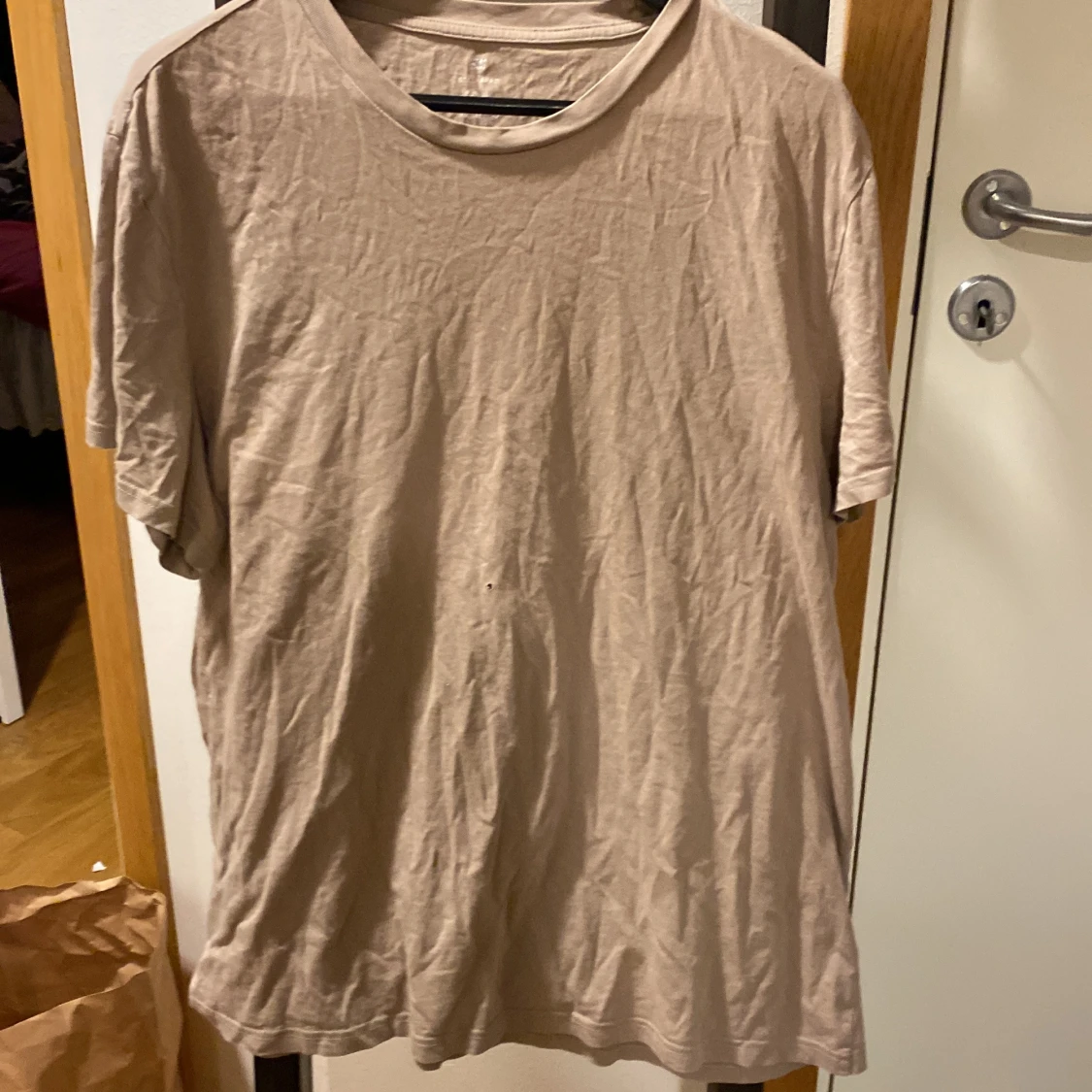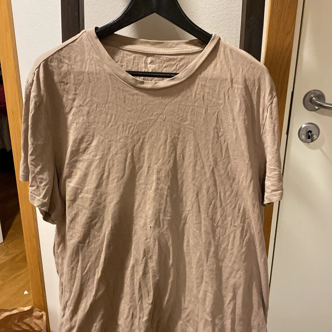 Säljer en enkel beige t-shirt i mjuk bomull. T-shirten har rund halsringning och korta ärmar. Perfekt för en avslappnad stil och lätt att matcha med andra plagg. Ett hål på, litet.