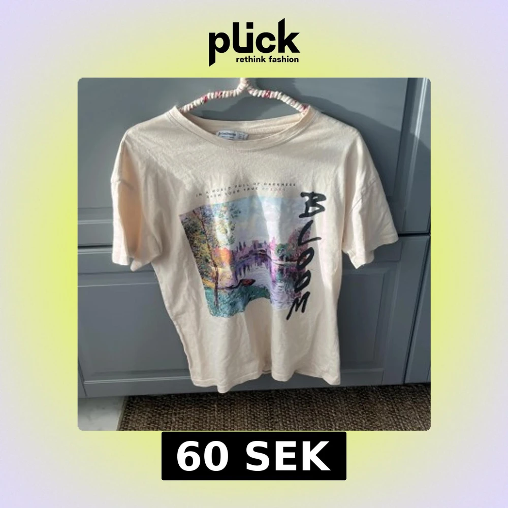 Beige t-shirt från Stradivarius med färgstarkt konstmotiv framtill och texten 'BLOOM'. T-shirten har rund halsringning och korta ärmar. Materialet är mjuk bomull och trycket har en konstnärlig vibe med pastelliga färger och stadsmotiv.