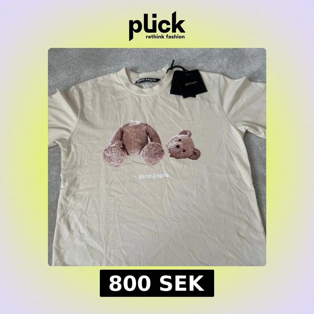 Säljer en beige t-shirt från Palm Angels med ikoniskt nallebjörn-tryck på framsidan och stor vit logga på ryggen. T-shirten har rund hals och är kortärmad. Perfekt statement-plagg för dig som gillar streetwear. Storlek S men passar även M