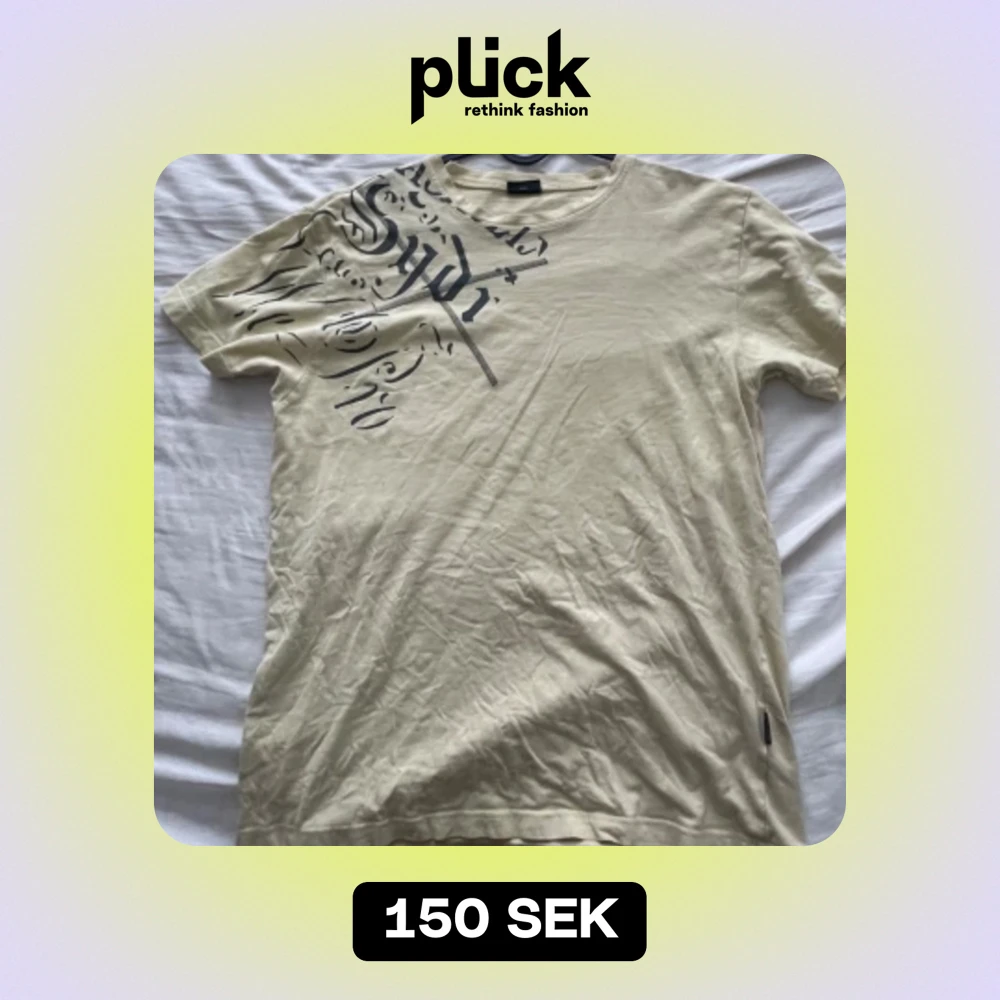 Säljer en beige t-shirt med ett coolt tryck över bröstet. Den är kortärmad och perfekt för en avslappnad stil. Materialet känns mjukt och bekvämt, perfekt för vardagsbruk. strl XXL men är mindre i storlek