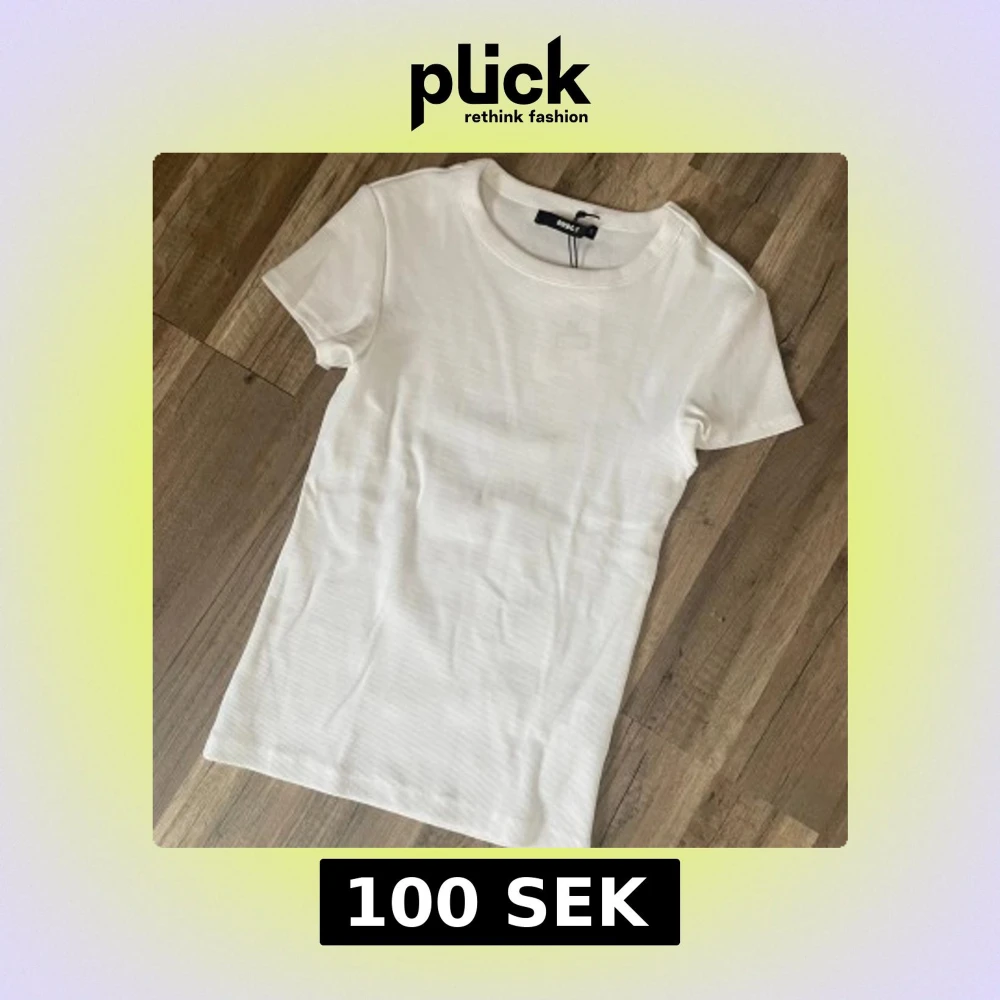 Vit ribbad t-shirt från Bik Bok i storlek S. T-shirten har rund halsringning och korta ärmar. Perfekt basplagg med stilren look och smickrande passform.
