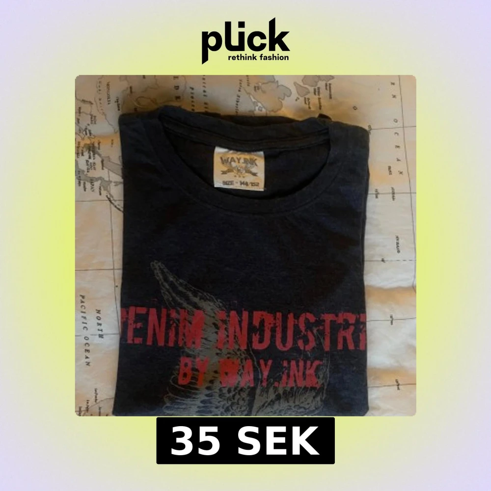 Snygg mörkgrå t-shirt från WAY INK med stort tryck av en örn och texten 'DENIM INDUSTRIE BY WAY INK' i rött och vitt framtill. Klassisk rund hals och korta ärmar.