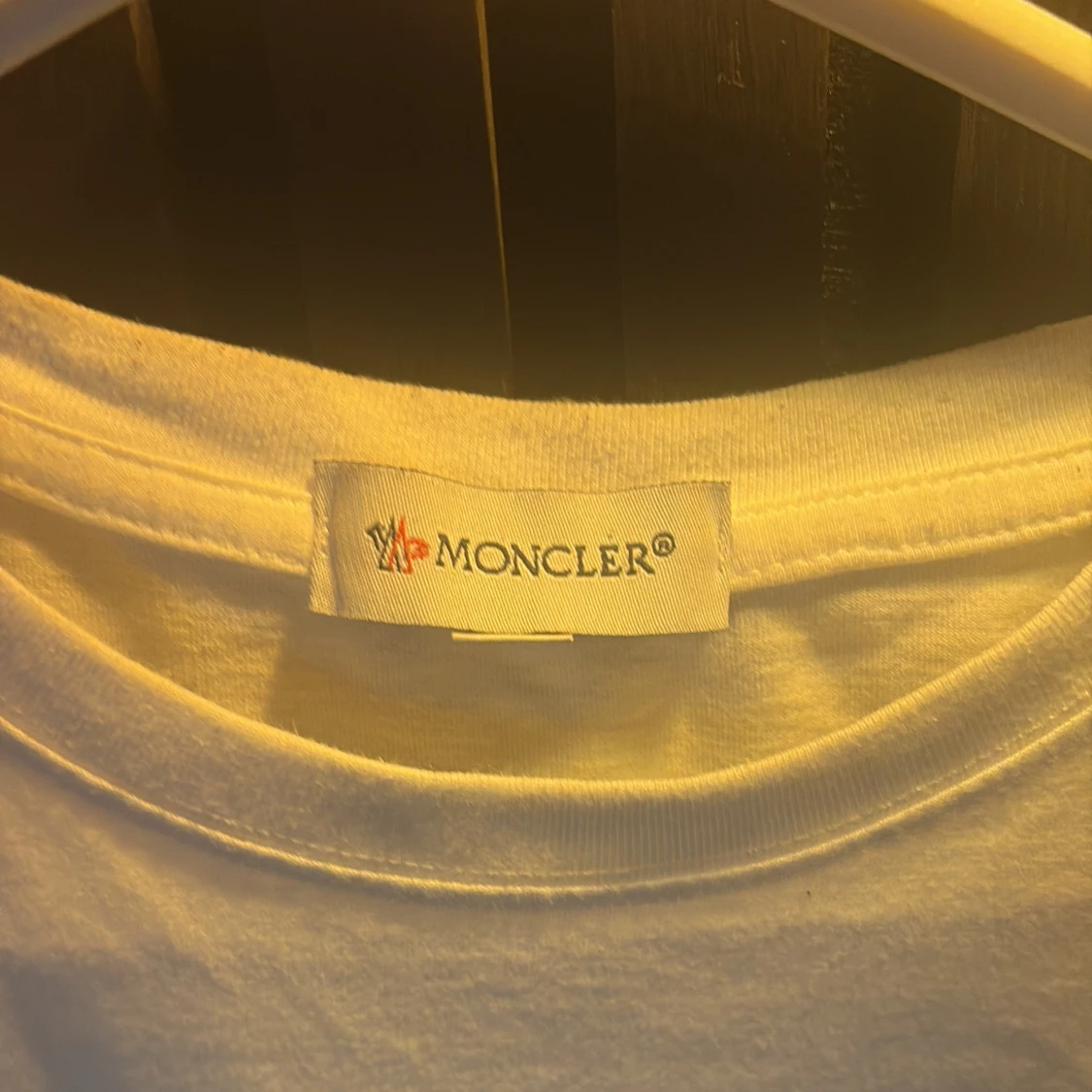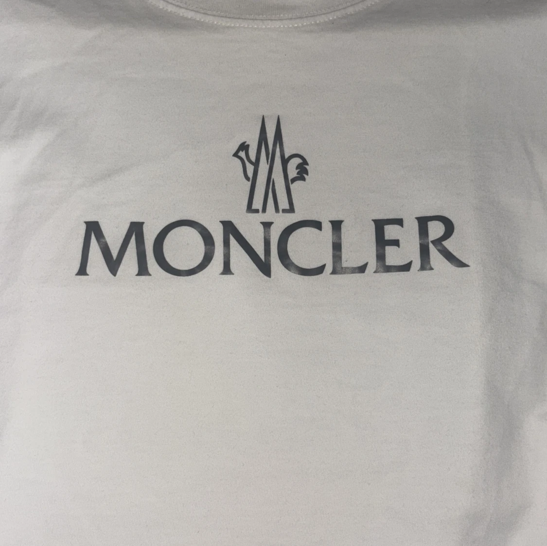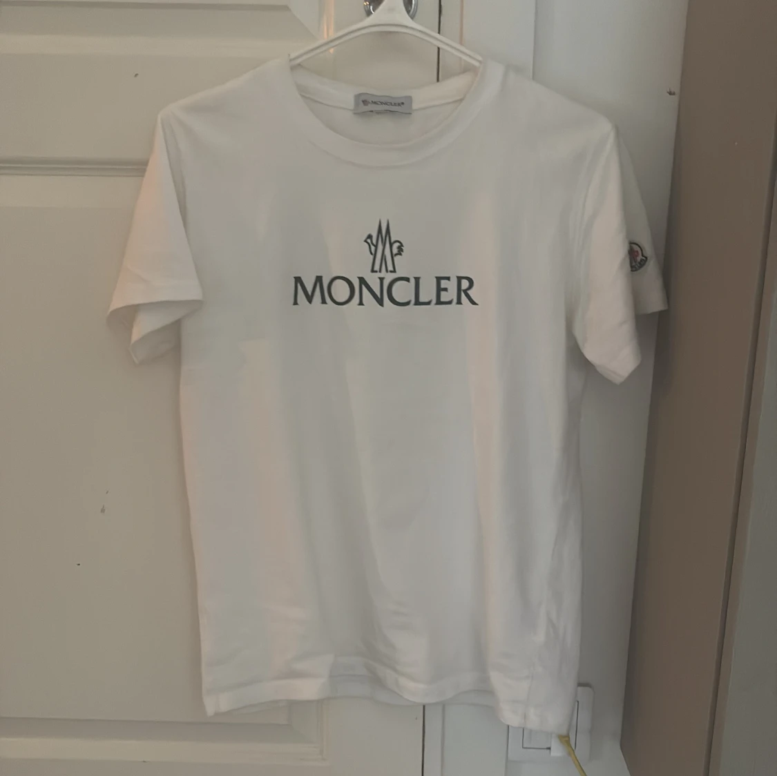 Vit t-shirt från Moncler med svart logotyp tryckt på bröstet och Moncler-märke på ärmen. Klassisk rund hals och korta ärmar. Tillverkad i mjuk bomull för skön passform. Perfekt för dig som gillar stilrena designer och exklusiva märken. T-shirten är i storlek M men är liten i storlek vilket gör att den sitter som S. Priset är absolut inte spikat. Bara att höra av sig om det finns något intresse!