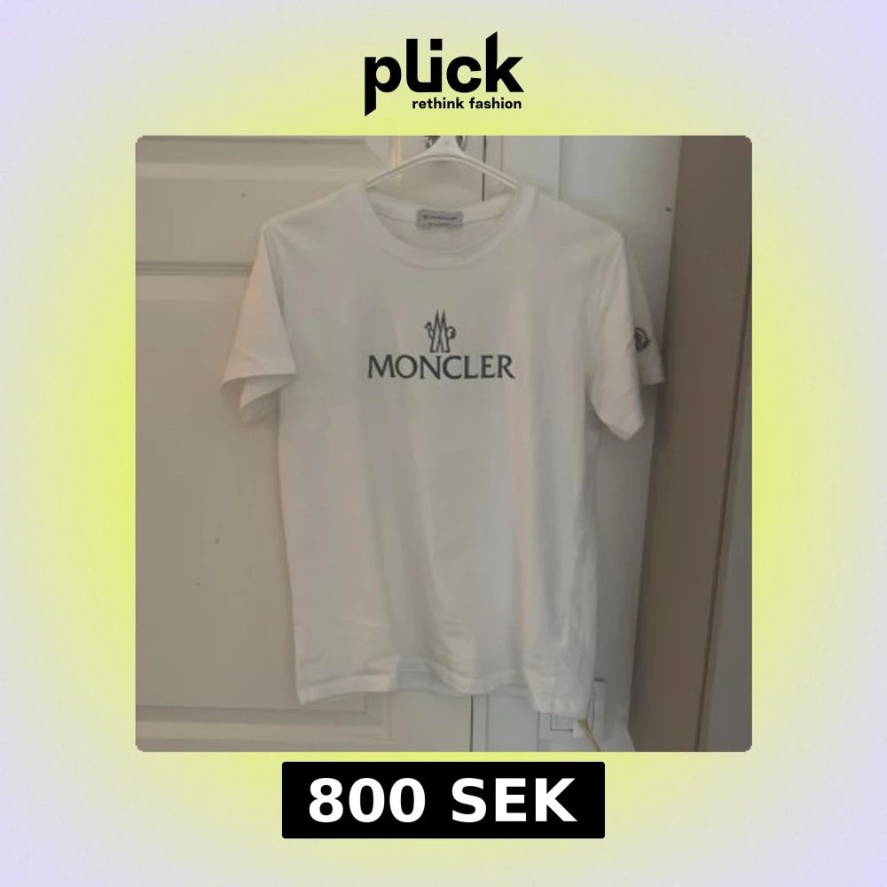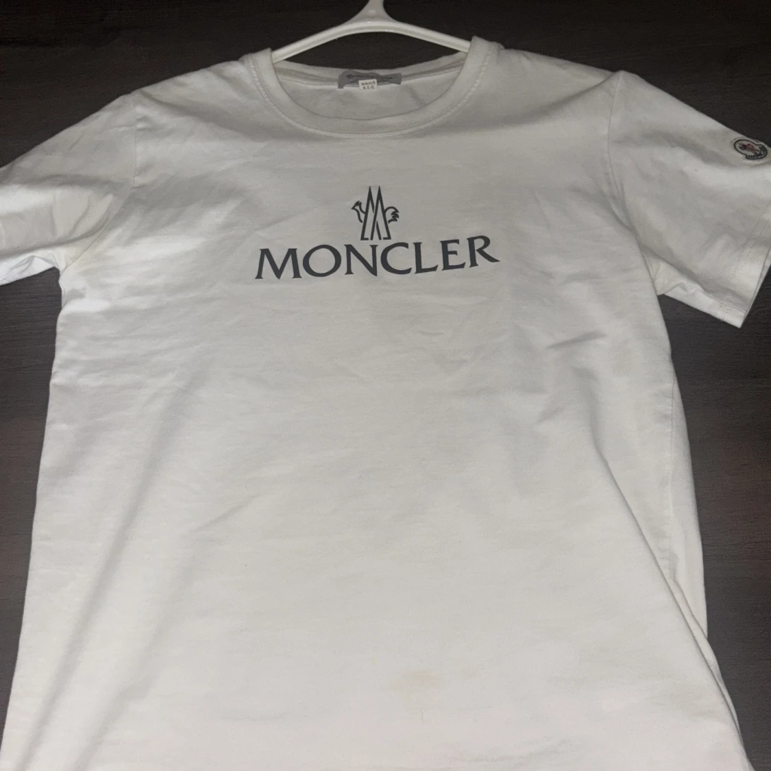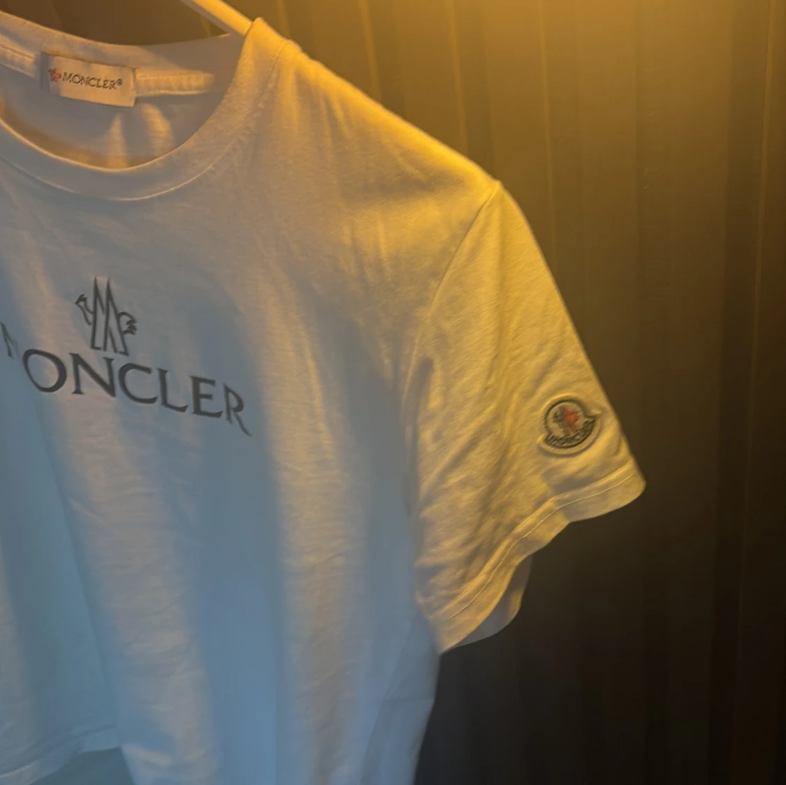 Vit t-shirt från Moncler med svart logotyp tryckt på bröstet och Moncler-märke på ärmen. Klassisk rund hals och korta ärmar. Tillverkad i mjuk bomull för skön passform. Perfekt för dig som gillar stilrena designer och exklusiva märken. T-shirten är i storlek M men är liten i storlek vilket gör att den sitter som S. Priset är absolut inte spikat. Bara att höra av sig om det finns något intresse!