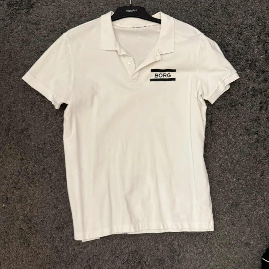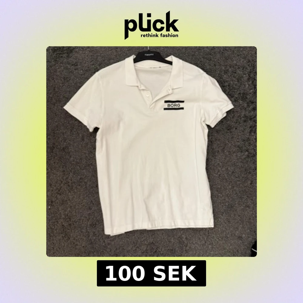 Säljer en stilren vit t-shirt från Björn Borg med korta ärmar och en klassisk krage. T-shirten har en diskret logga på bröstet och är perfekt för en avslappnad look. Storlek L
