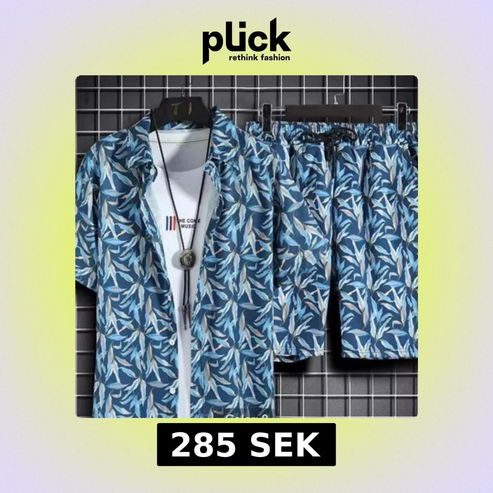 Snygg blå kortärmad skjorta med blommigt mönster i vitt och beige. Skjortan har klassisk krage och knappar framtill. Perfekt för en avslappnad och trendig stil. Unikt! Shorts ingår.
