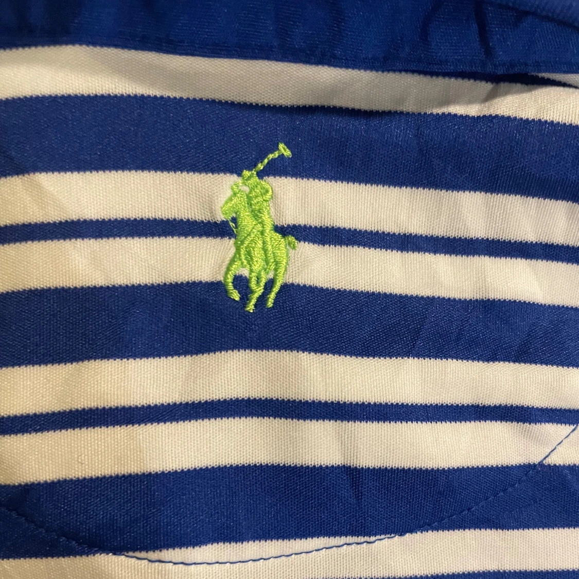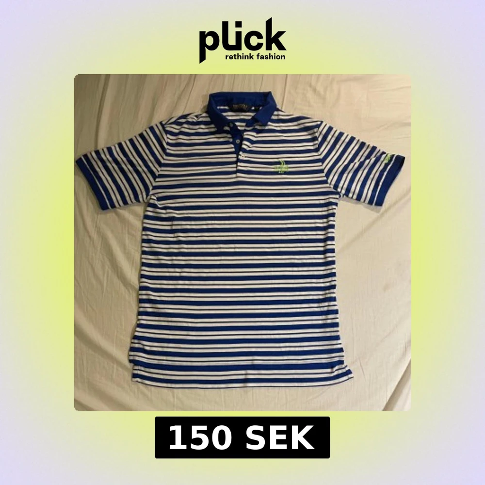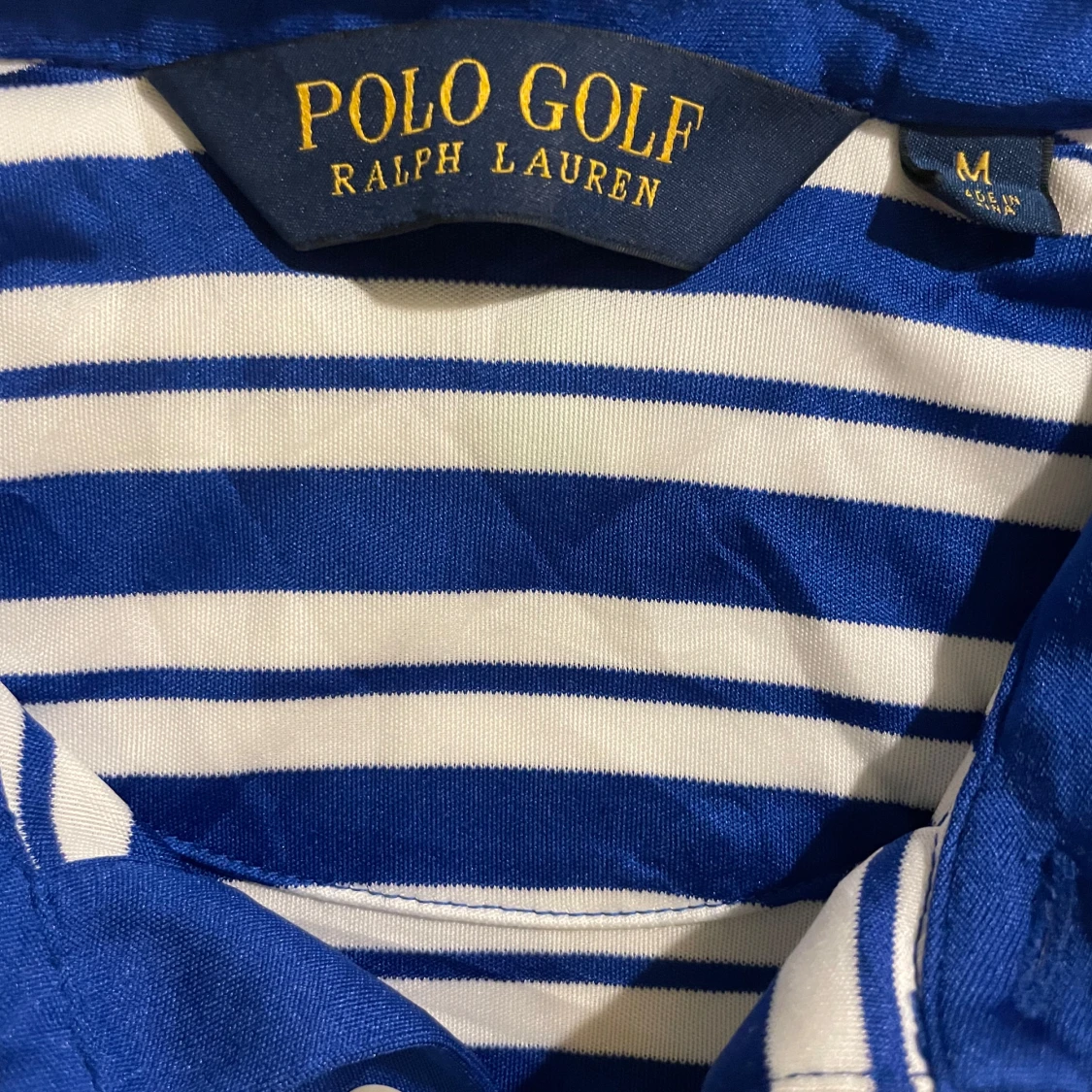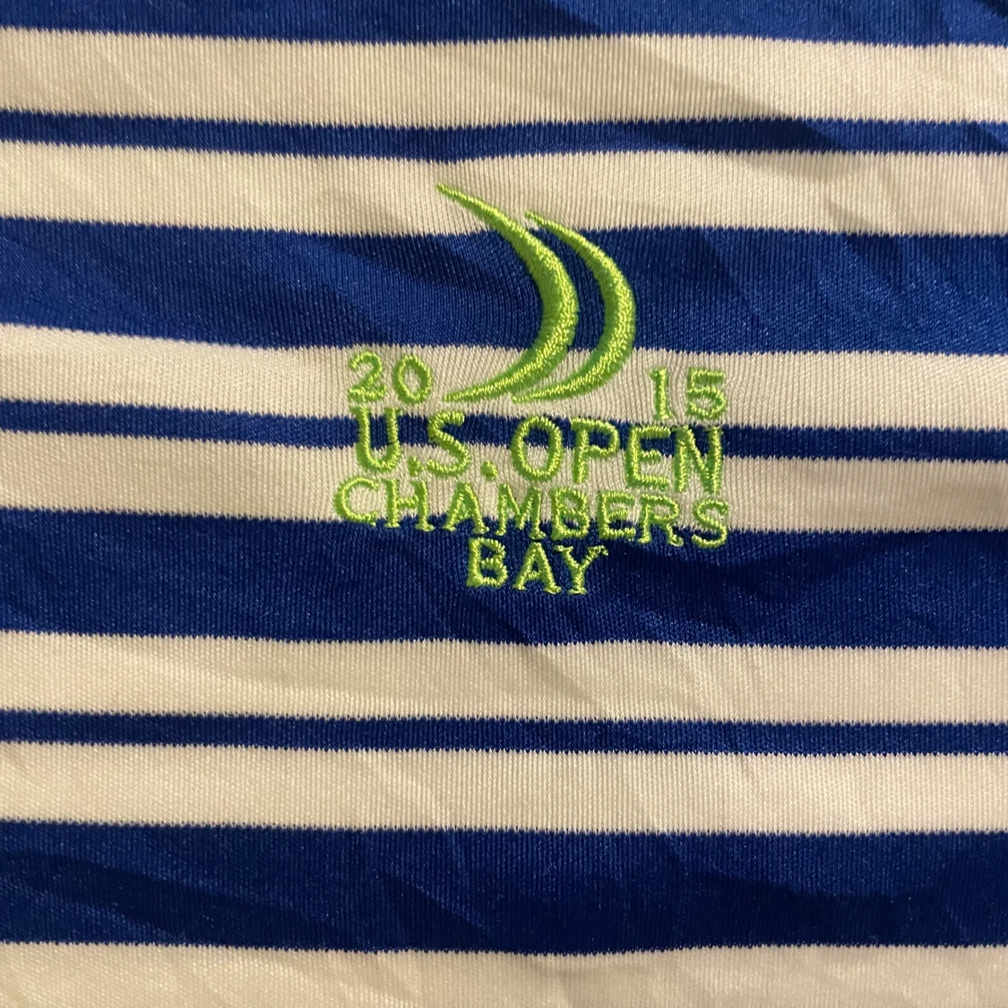 Snygg blå och vit randig pikétröja från Polo Golf Ralph Lauren med broderad logga för US Open Chambers Bay 2015. Perfekt för golfentusiasten. Tröjan har korta ärmar och en klassisk krage med knappar.