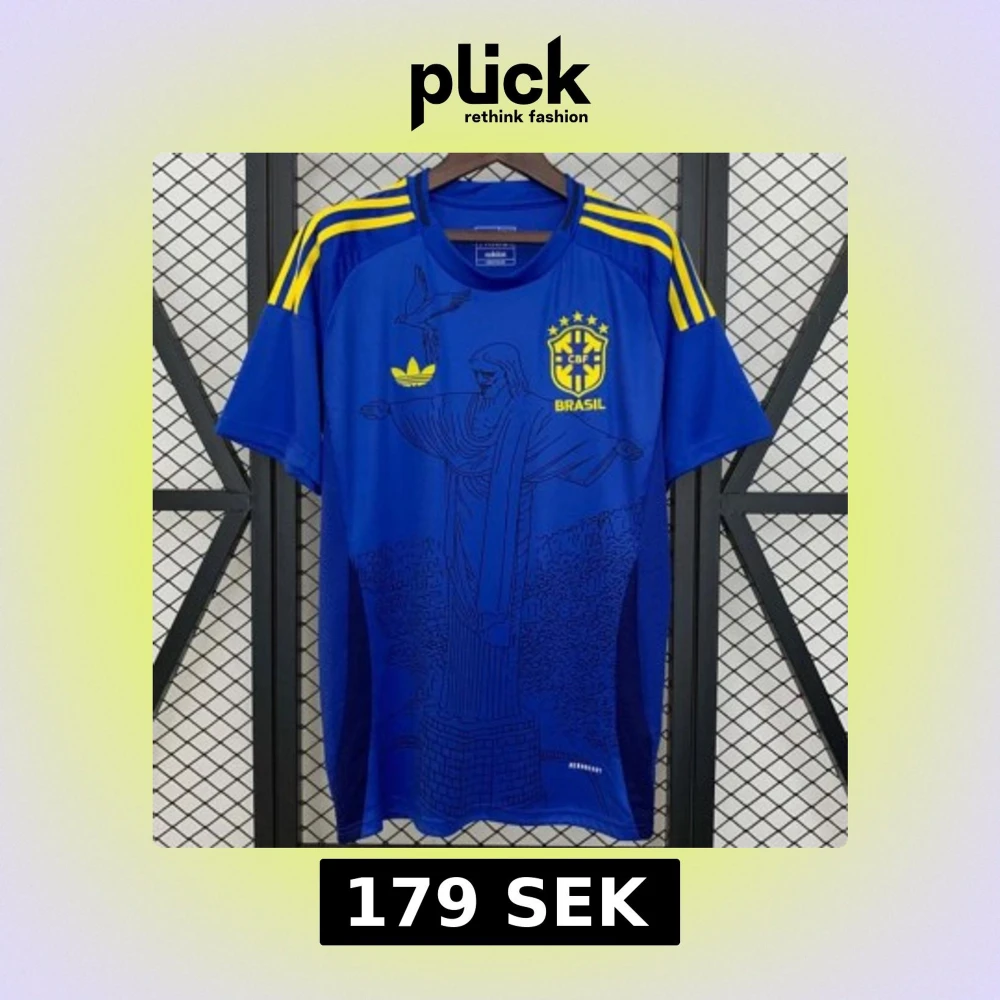 Snygg blå Brasil fotbollströja från Adidas med gula detaljer och tryck av Kristusstatyn på framsidan. Tröjan har korta ärmar, gula ränder på axlarna och Brasil-logga på bröstet. Materialet är lätt och andas, perfekt för träning eller match.