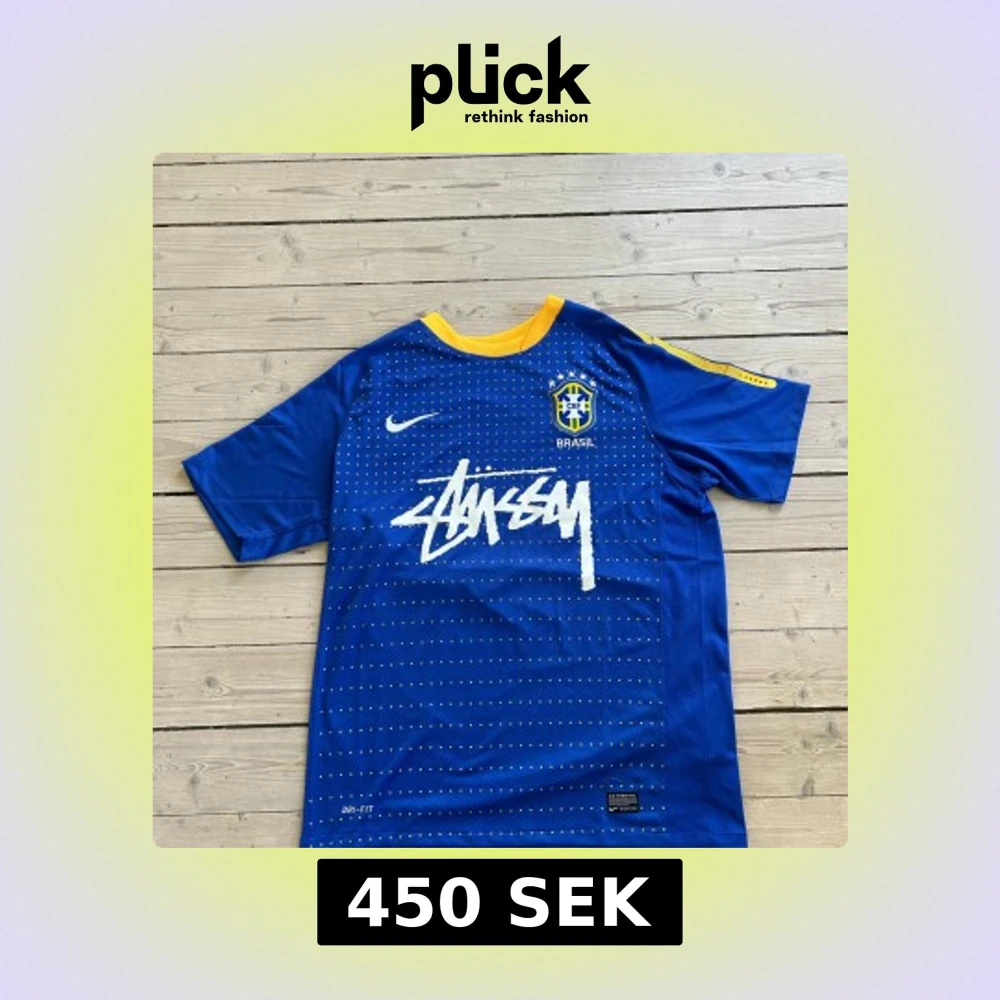 Säljer en blå Brasil fotbollströja från Nike i samarbete med Stussy. Tröjan har korta ärmar, gul krage och detaljer, samt vit Stussy-logga på bröstet. Materialet är Dri-Fit för bra ventilation. Perfekt för fotboll eller streetwear. Brasilien