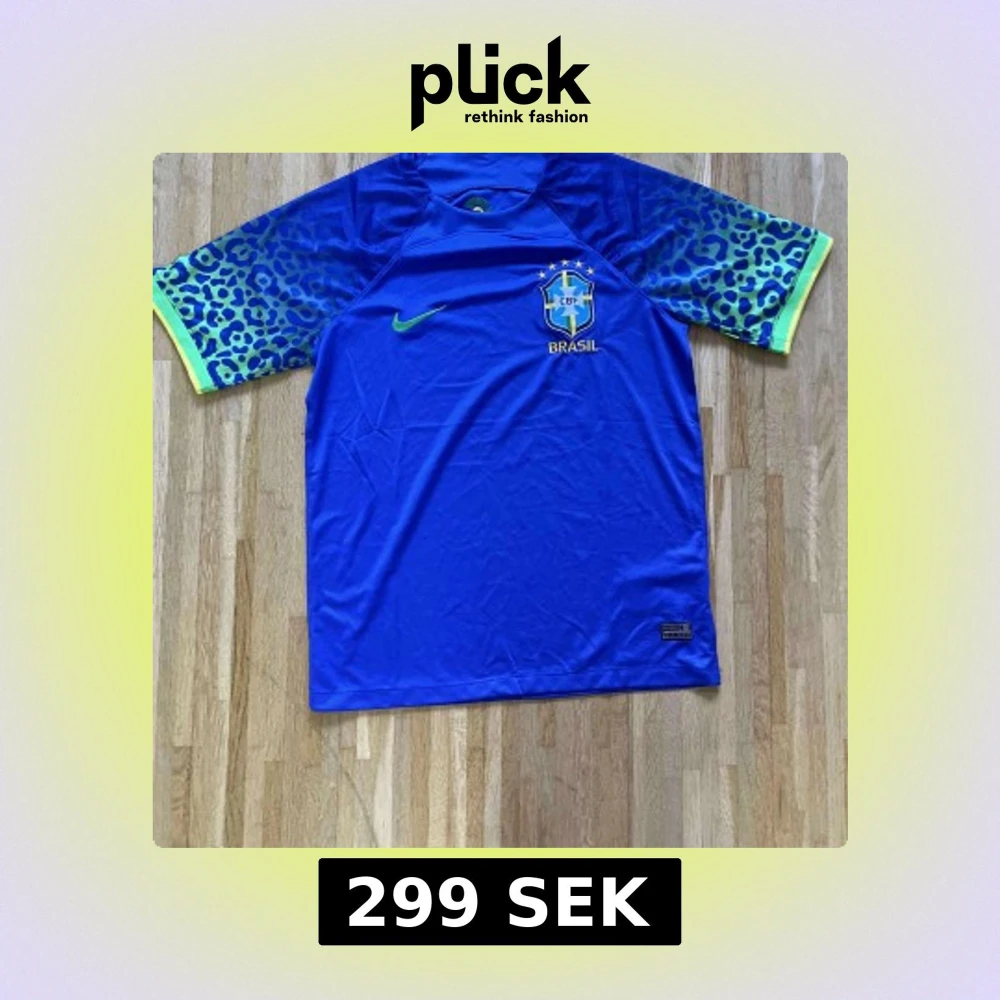 Snygg blå Brasilien fotbollströja från Nike med grönt Nike-märke och CBF-logga på bröstet. Ärmarna har leopardmönster i blått och grönt med gula muddar. Tillverkad i lätt och ventilerande material, perfekt för match eller träning.