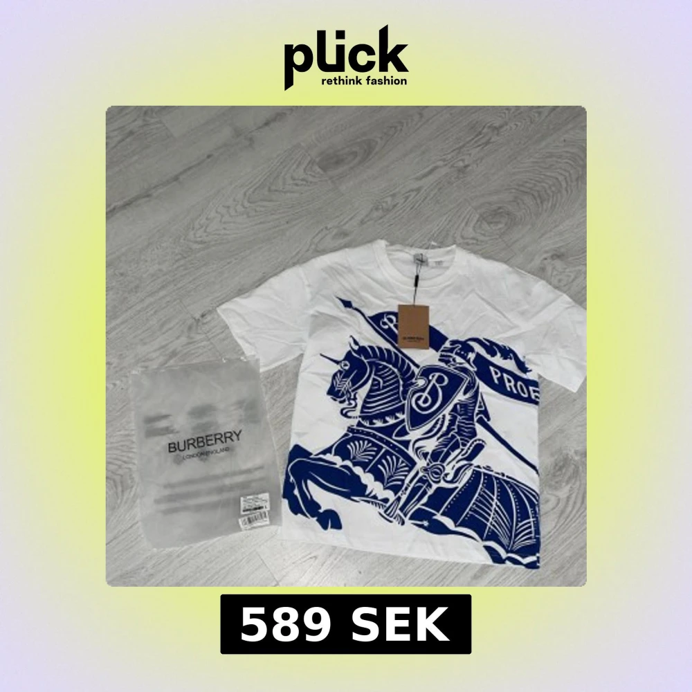 Snygg vit t-shirt från Burberry med stort blått tryck av riddare och flagga på framsidan. Klassisk rund hals och korta ärmar. Tillverkad i mjuk bomull och perfekt för dig som vill sticka ut med en exklusiv streetstyle-look. Hör av er vid funderingar eller intresse och priset är diksuterbart ✅❤️🚌‼️