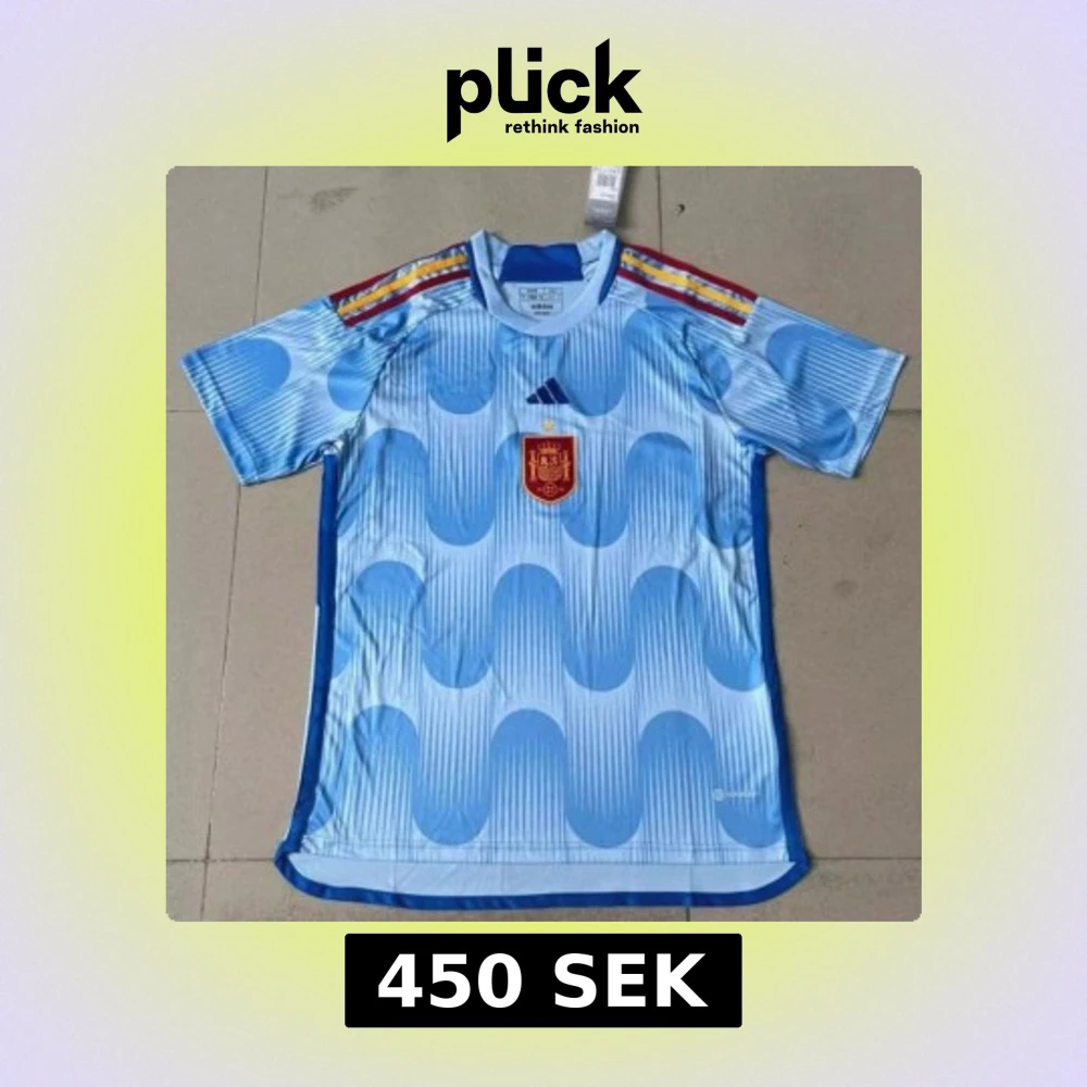 Snygg ljusblå fotbollströja från Adidas med vågigt mönster och korta ärmar. Tröjan har Spaniens emblem på bröstet och färgglada ränder på axlarna. Perfekt för fotbollsfans som vill visa sitt stöd med stil.