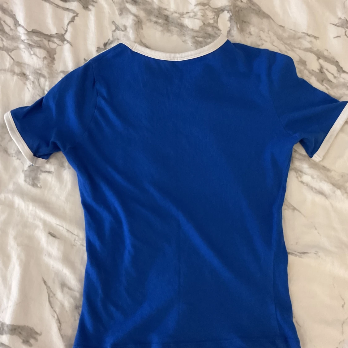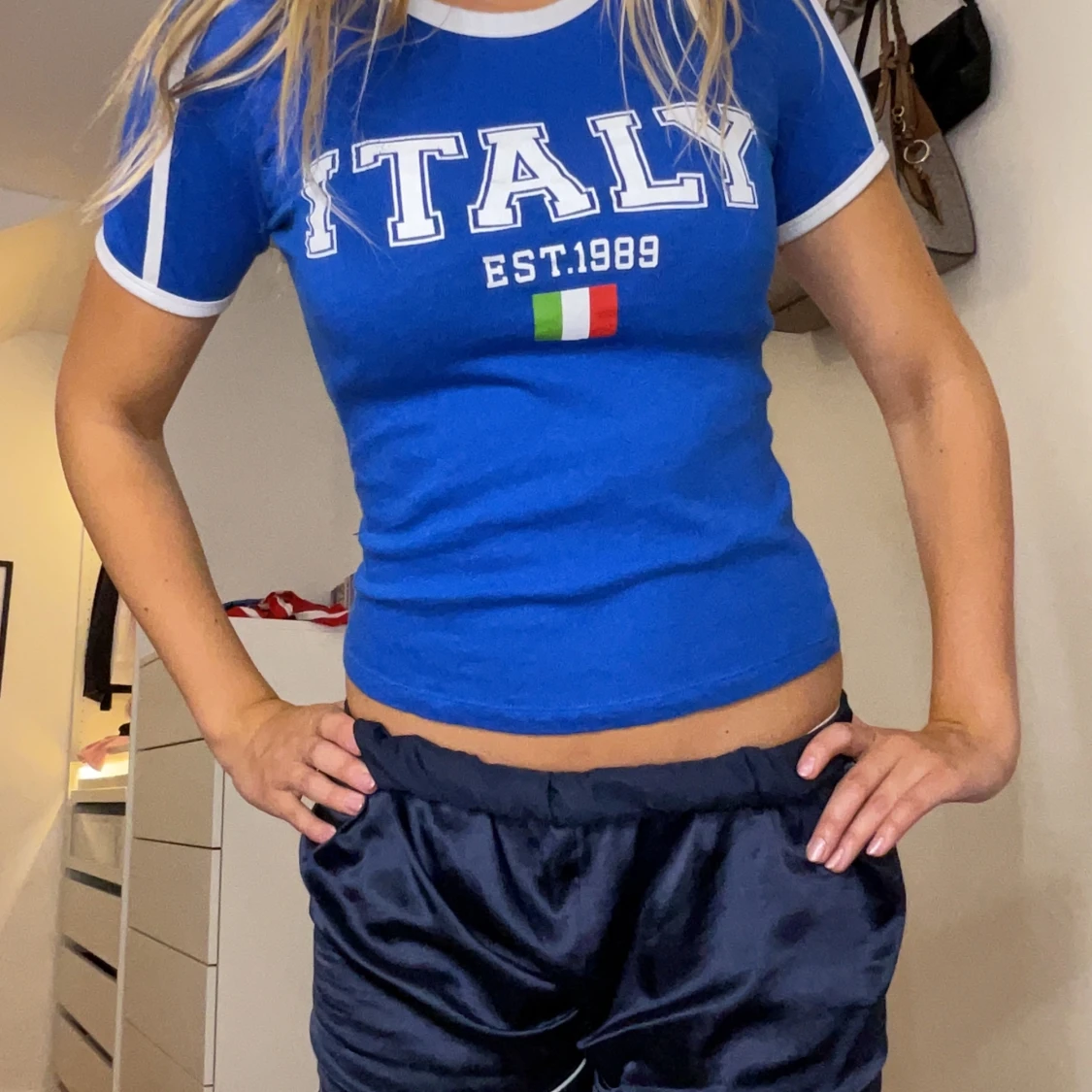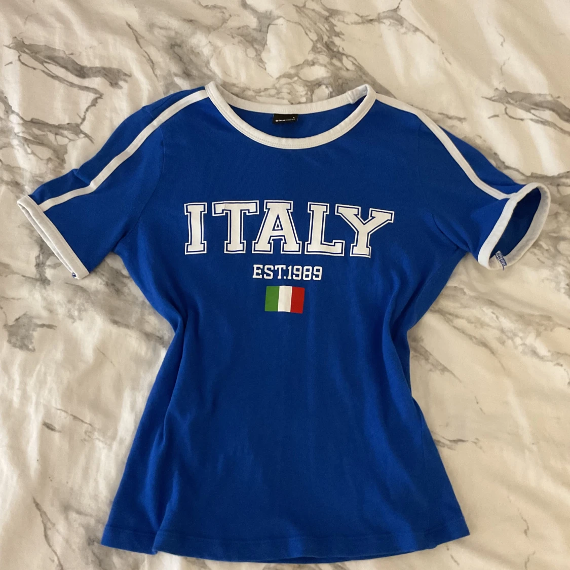 Blå t-shirt från Bershka med vit text 'ITALY EST.1989' och italienska flaggan framtill. T-shirten har vita kontrastdetaljer vid halsringning och ärmslut samt sportiga ränder på ärmarna. Modellen är figurnära och kortärmad, perfekt för en sportig vibe.