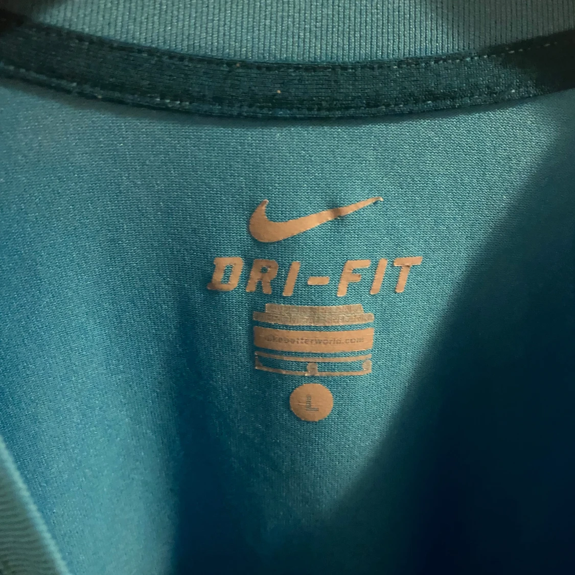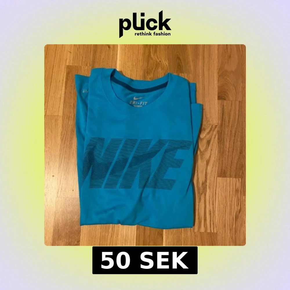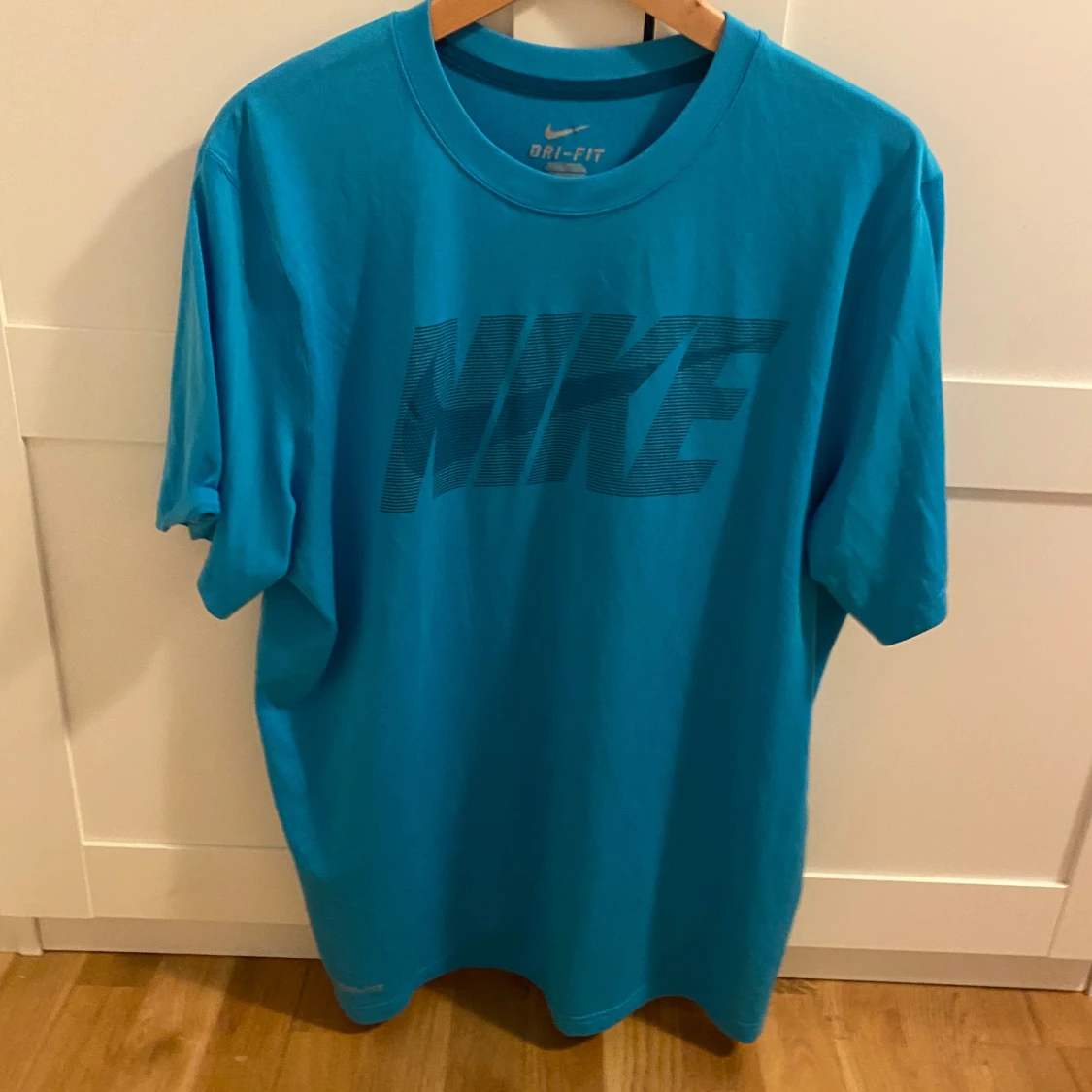 Snygg blå t-shirt från Nike med stort svart logotryck över bröstet. Tillverkad i Dri-Fit-material som andas och håller dig torr. Klassisk passform med rund hals och korta ärmar, perfekt för träning eller chill.