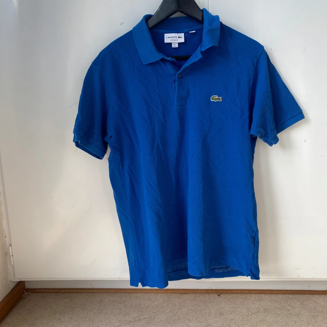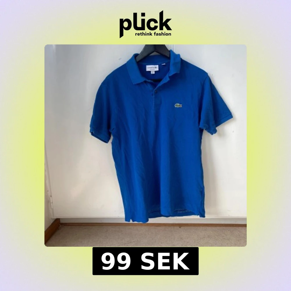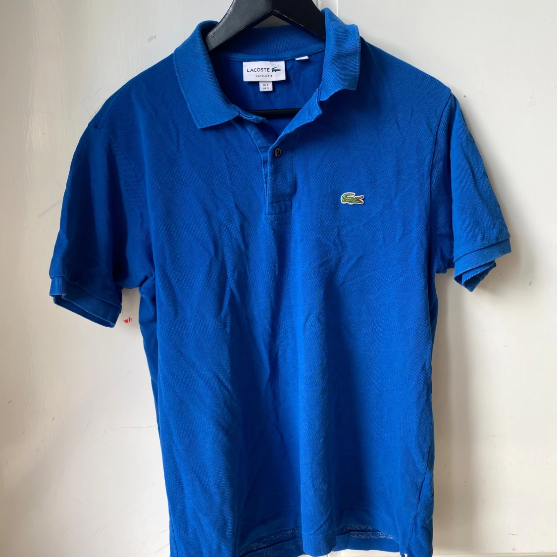 Säljer en klassisk blå pikétröja från Lacoste med korta ärmar och den ikoniska krokodilloggan på bröstet. Perfekt för en clean och sportig stil. Tröjan har krage och knappar vid halsen.