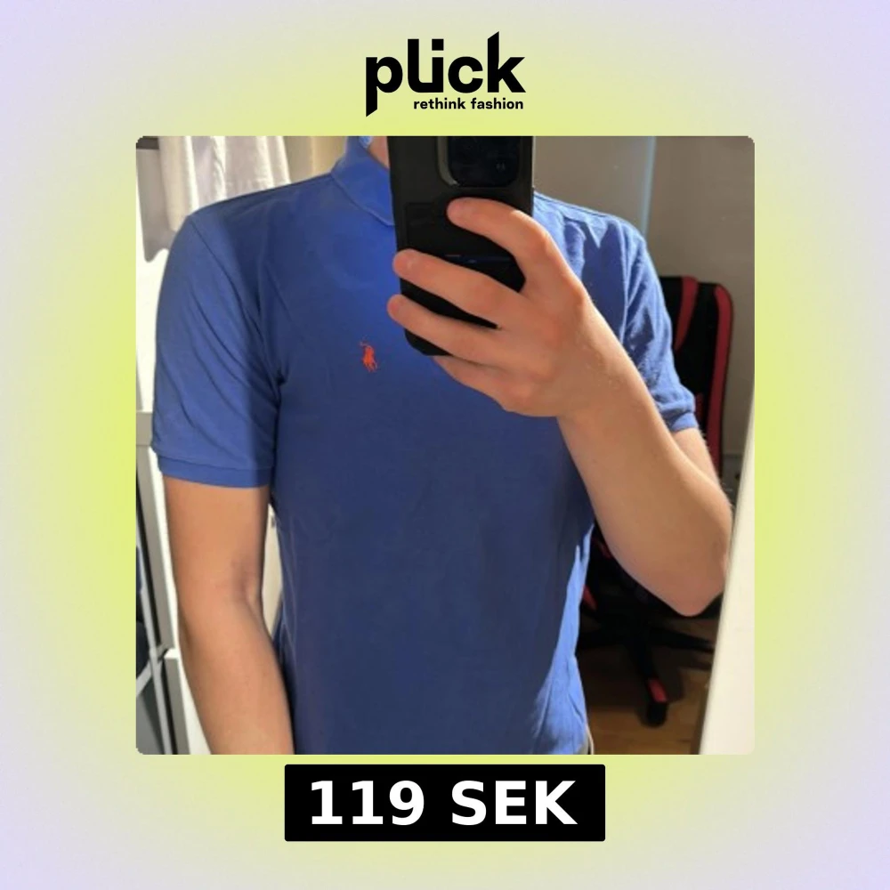 Säljer en klassisk blå pikétröja från Ralph Lauren med orange broderad logga på bröstet. Tröjan har korta ärmar, krage och två knappar vid halsen. Perfekt för en stilren och avslappnad look. M men känns som S. Äldre taggen
