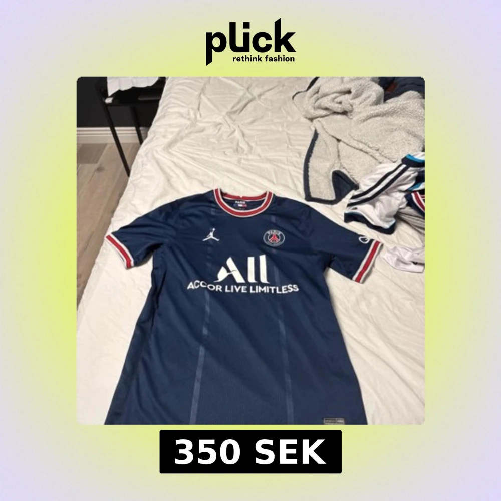 Snygg blå PSG fotbollströja från Jordan med korta ärmar och vita samt röda detaljer. Tröjan har klubbens emblem på bröstet och texten 'Accor Live Limitless' på framsidan. Perfekt för fotbollsfans! Äkta kosta 1100 ny pris kan diskuteras