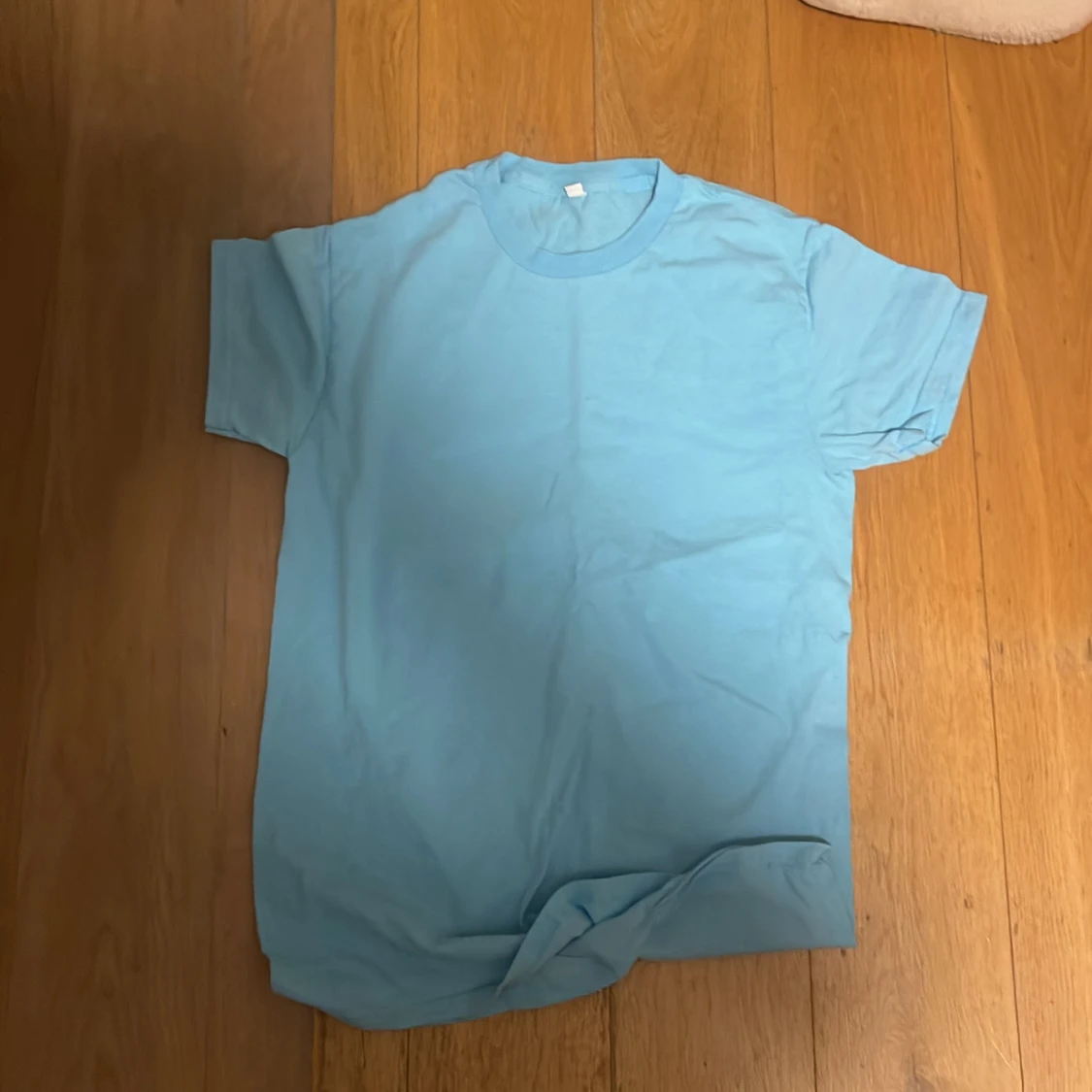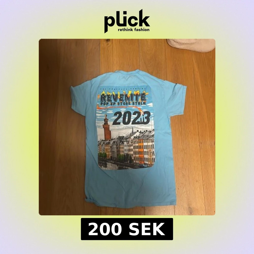 Ljusblå t-shirt från Revenite Pop Up Store Sthlm 2023 med stor färgglad print på ryggen som visar Stockholms stadshus och husfasader. Klassisk rund hals och korta ärmar. Skön och mjuk i bomull, perfekt för dig som gillar streetwear och unika tryck.