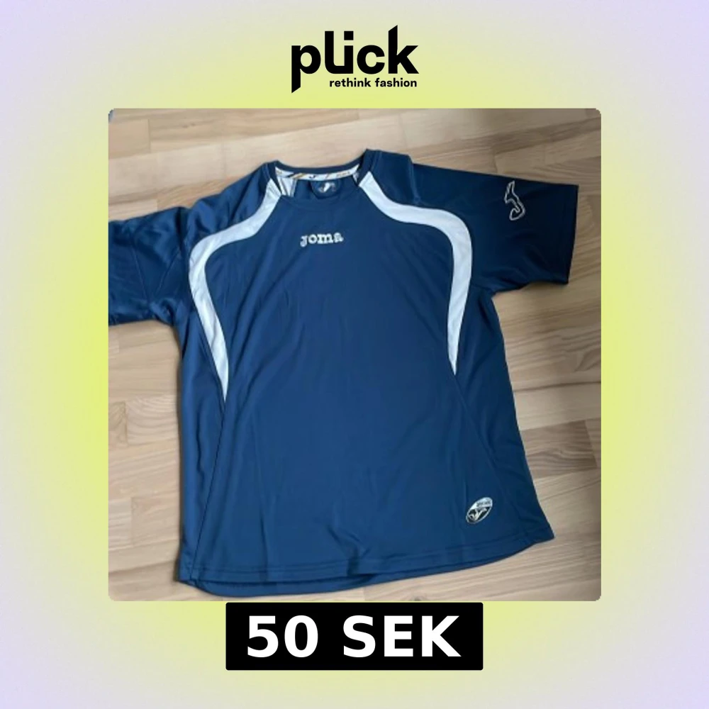 Säljer en blå t-shirt från Joma med vita detaljer längs axlar och sidor. Perfekt för träning eller fotboll. Tillverkad i syntetmaterial som andas och torkar snabbt. Klassisk passform och kortärmad modell.