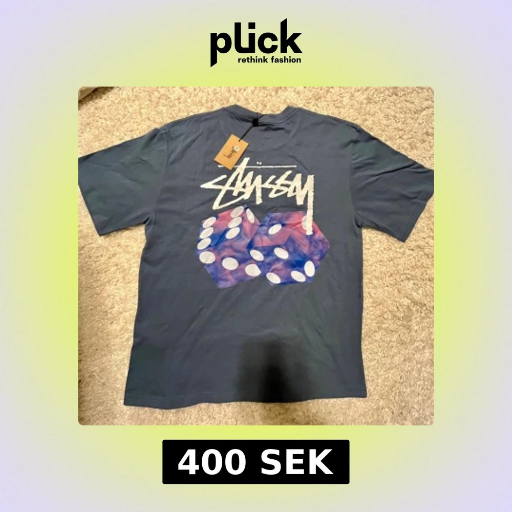 Helt nya snygg blå t-shirt från Stüssy med stort vitt logotryck och två färgglada tärningar på ryggen. Framtill finns en mindre Stüssy-logga. Tillverkad i 100% bomull med klassisk passform och korta ärmar. Perfekt för dig som gillar streetwear och coola prints.