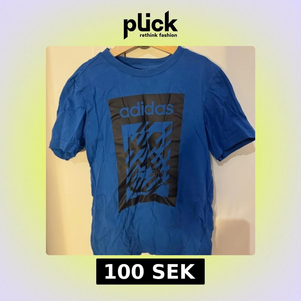 Säljer en blå t-shirt från Adidas med ett stort tryck på framsidan. T-shirten är kortärmad och har en rund halsringning. Perfekt för sportiga aktiviteter eller en avslappnad stil.