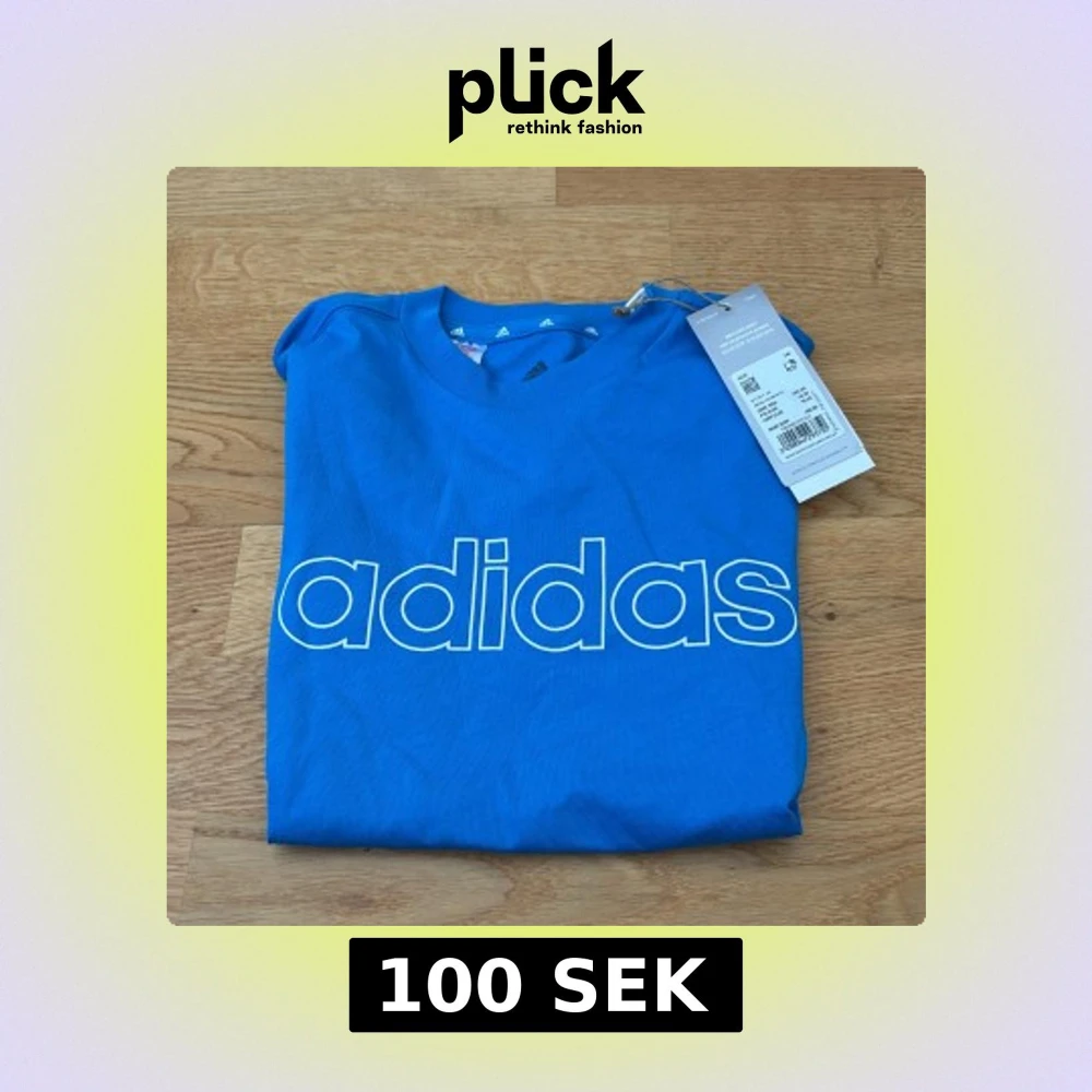Säljer en blå t-shirt från Adidas med stort vitt logotryck på framsidan och mindre logga på baksidan. Perfekt för sportiga aktiviteter eller en avslappnad stil. Tillverkad i mjukt material för extra komfort.