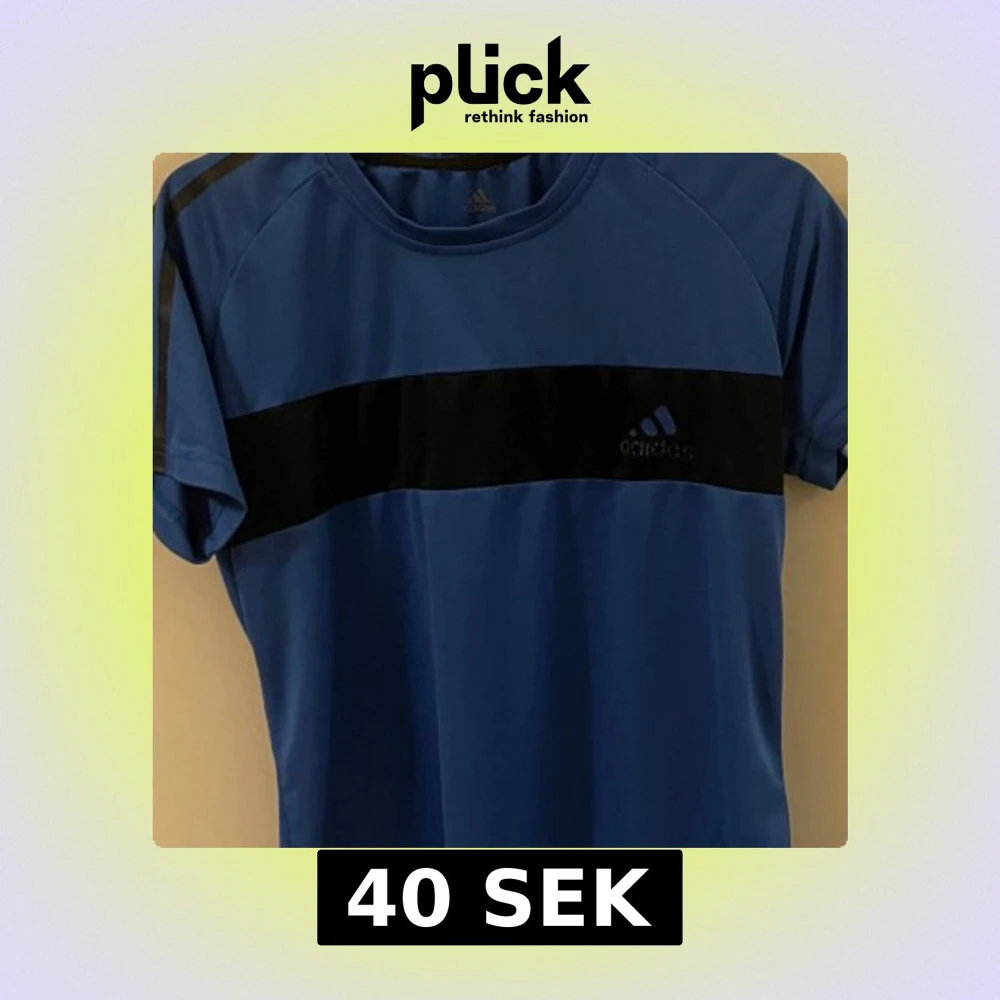 Snygg blå t-shirt från Adidas med en svart horisontell rand över bröstet. Perfekt för träning eller vardagsbruk. Den har korta ärmar och en rund halsringning.