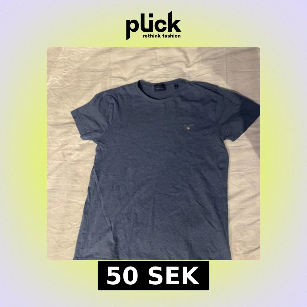 Säljer en klassisk blå t-shirt från GANT med liten broderad logga på bröstet. T-shirten har rund halsringning och är tillverkad i mjuk bomull.