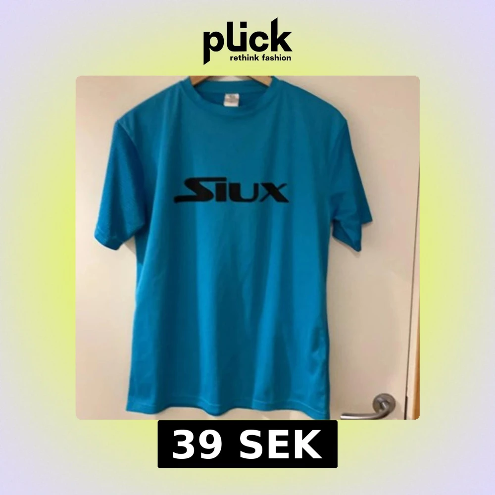 Säljer en blå t-shirt från Siux med svart logga tryckt på bröstet. T-shirten har rund halsringning och korta ärmar. Perfekt för dig som gillar sportig stil.