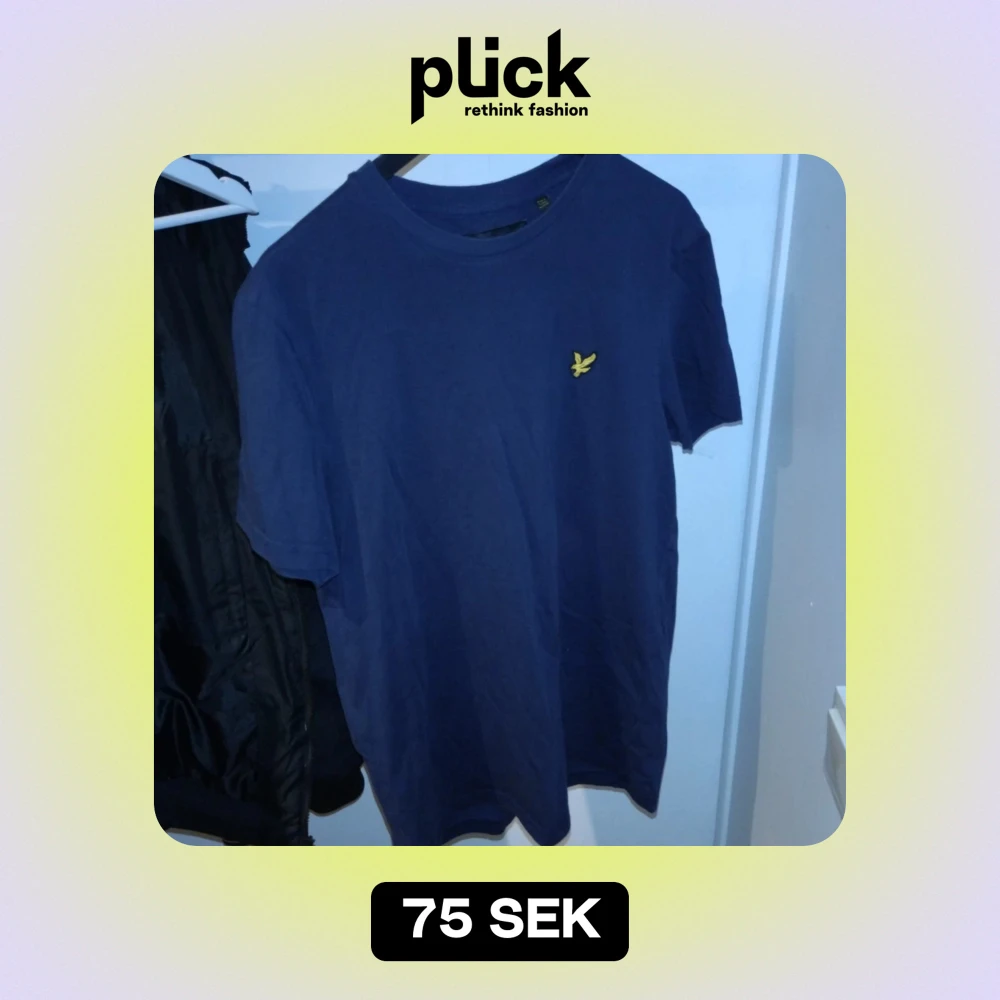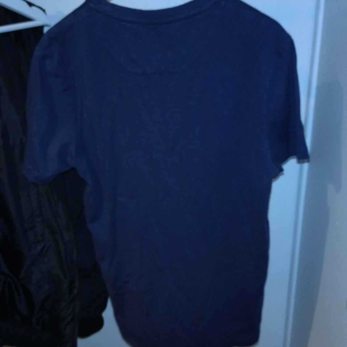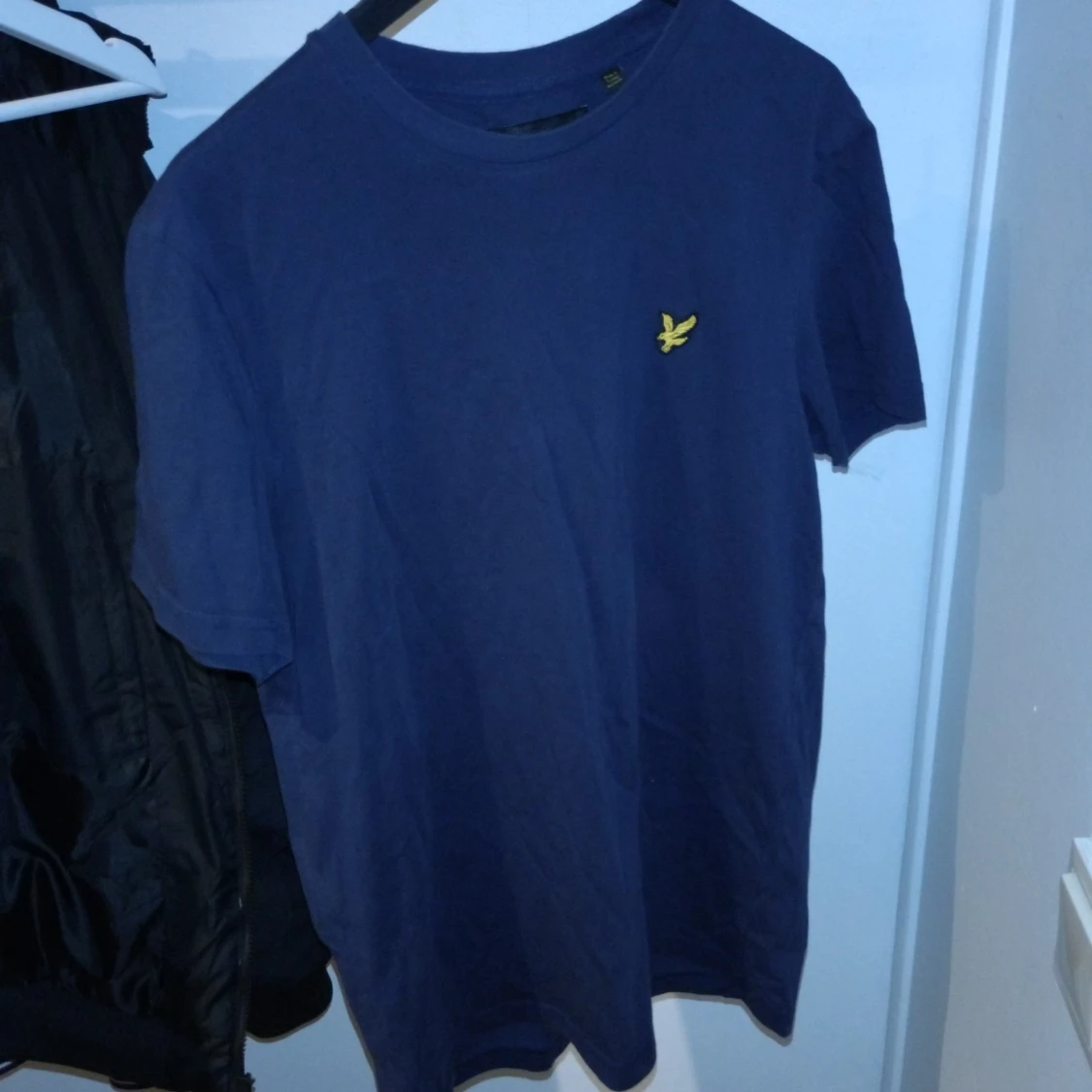 Säljer en blå t-shirt från Lyle & Scott i bra skick. Den har en gul broderad logga på bröstet. Perfekt för vardagsbruk eller en avslappnad dag ute. Några små fläckar finns, men inget som stör helhetsintrycket.