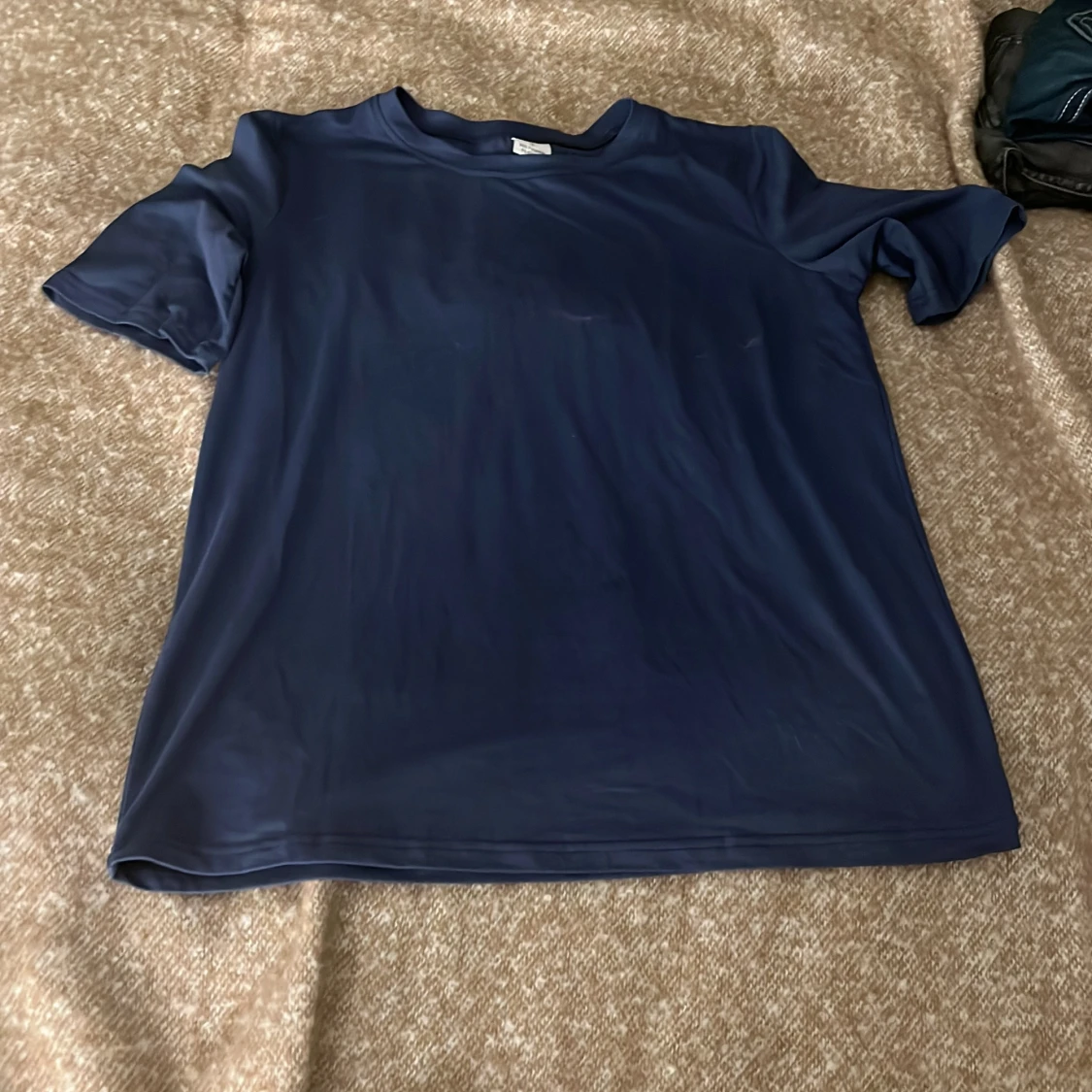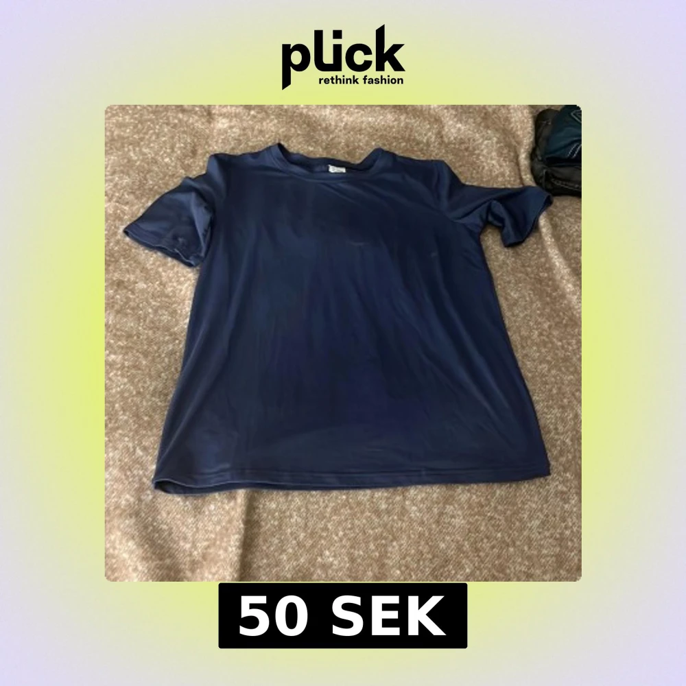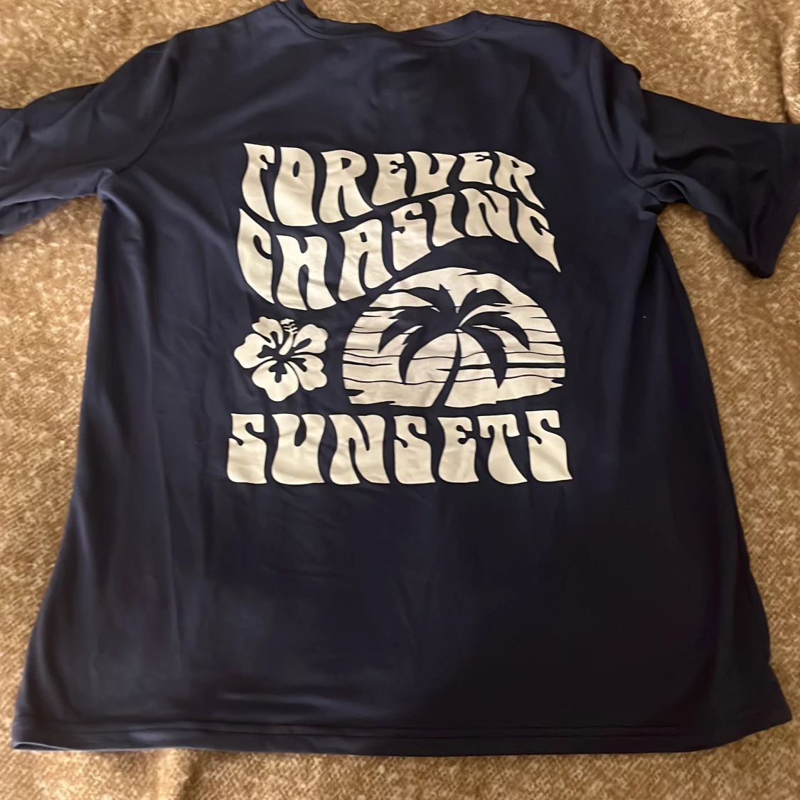 Snygg marinblå t-shirt i mjuk och stretchig polyester med coolt vitt tryck på ryggen: 'Forever Chasing Sunsets' med palm och blomma. Perfekt för dig som gillar chill vibes och grafiska prints. Rund hals och korta ärmar, passar dig som vill ha en relaxed stil.
