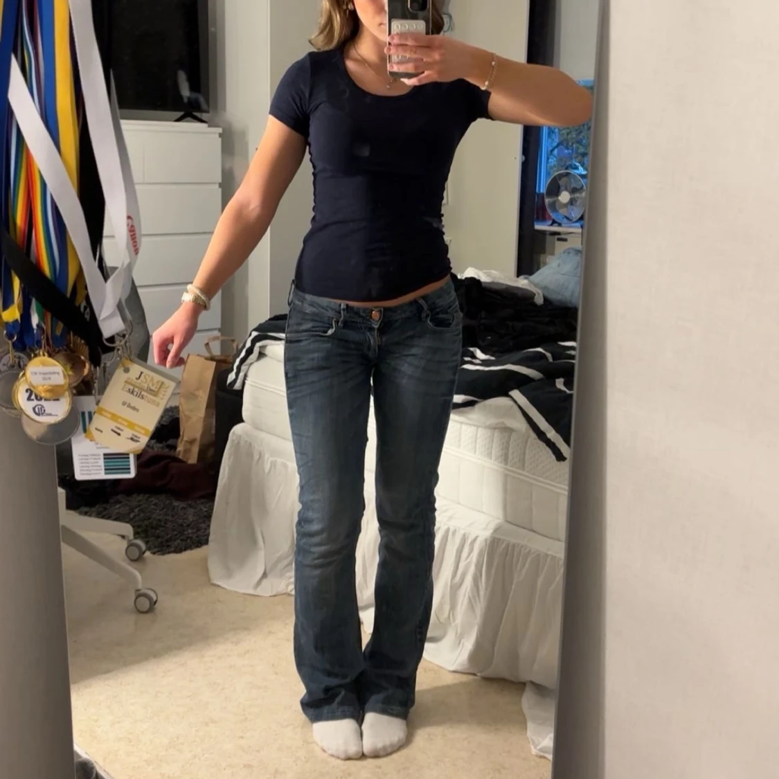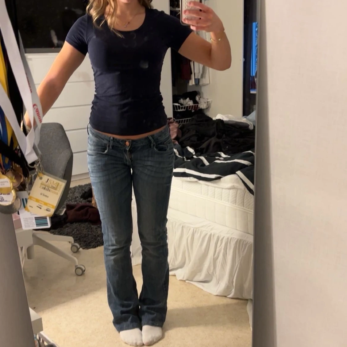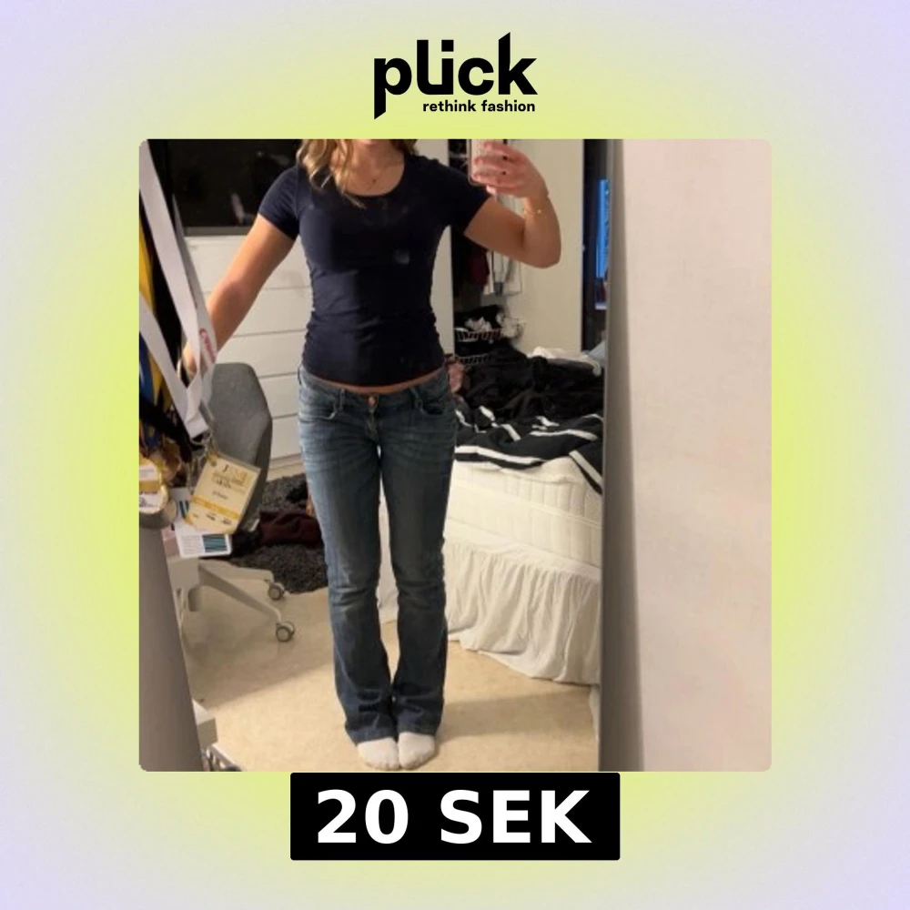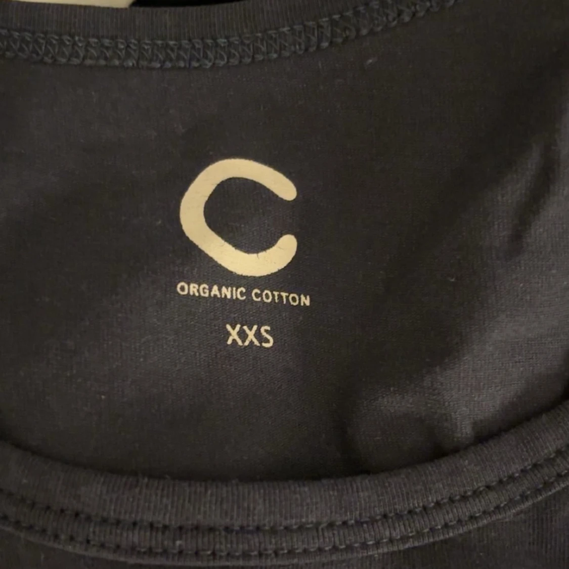 Vanlig blå T-shirt som passar till allt. Jag har inte använt den mycket alls men är i ett väldigt skönt material.