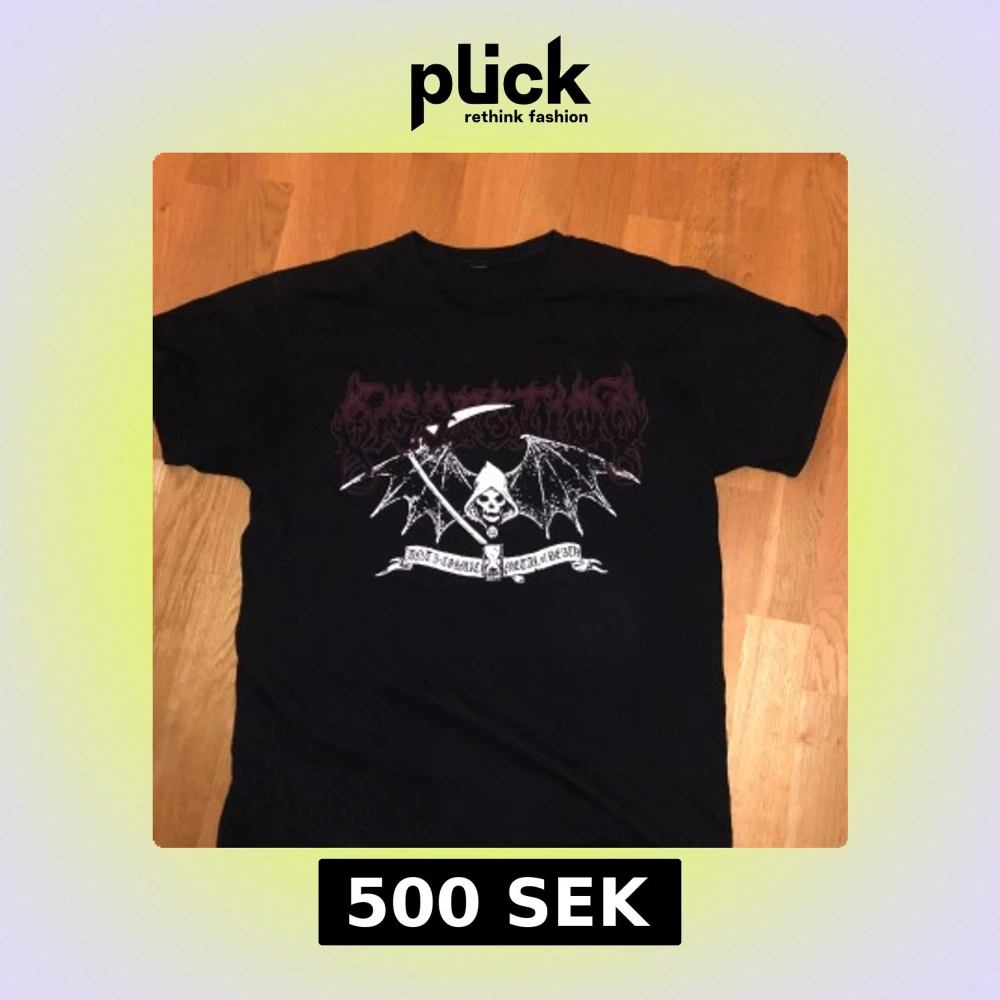 Säljer en svart t-shirt med ett unikt tryck fram och bak. Framsidan har ett motiv med en dödskalle och vingar, medan baksidan har ett detaljerat mönster med ormar och symboler. Perfekt för dig som gillar alternativ stil.