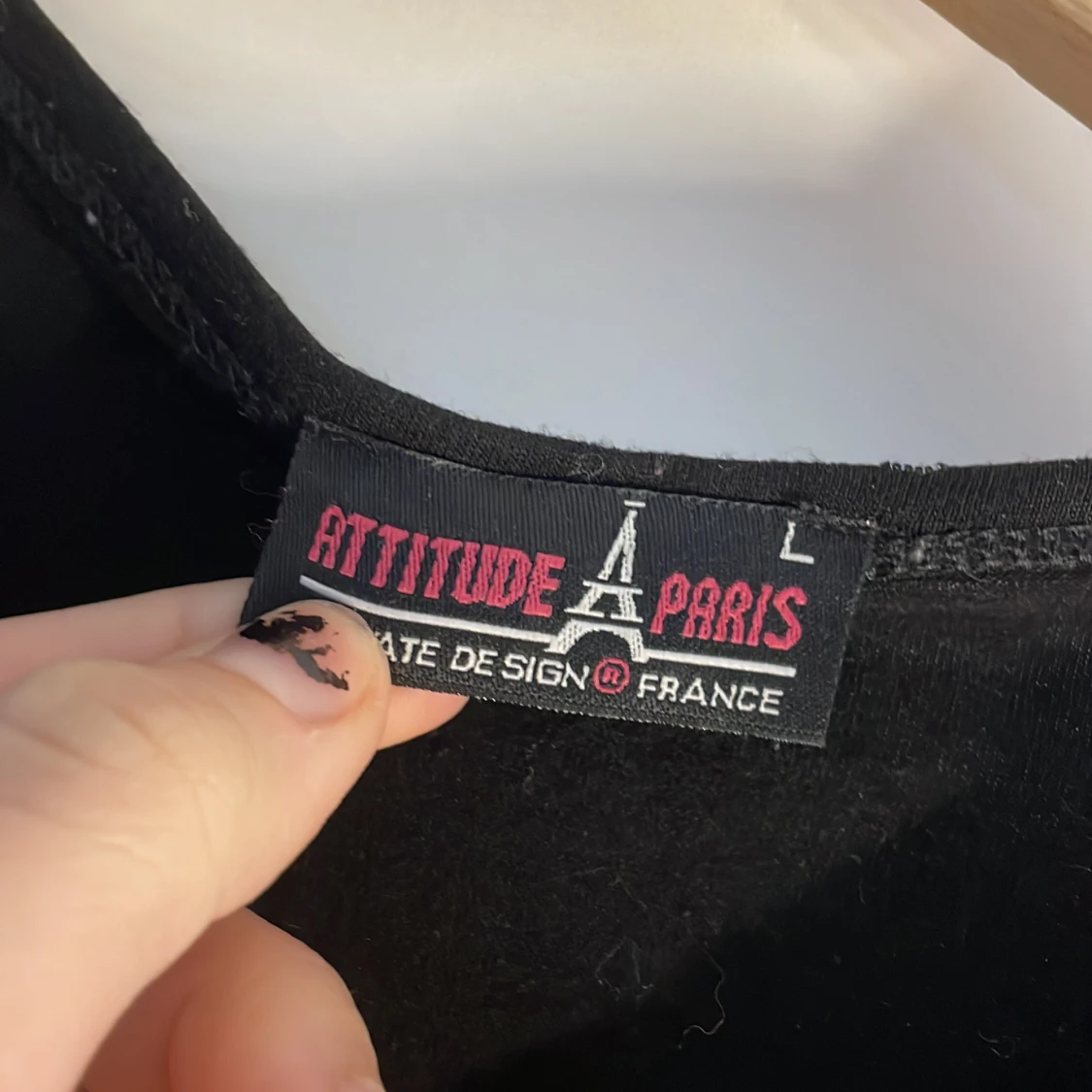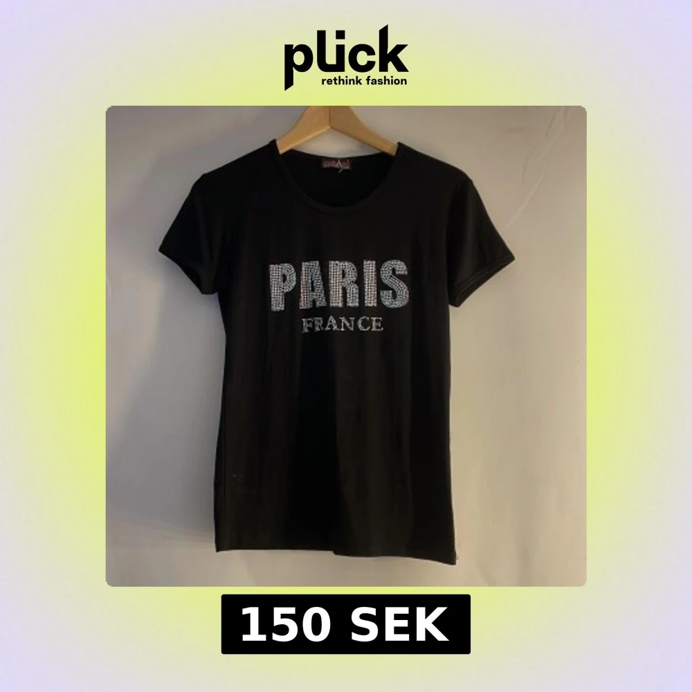 Snygg svart t-shirt från Attitude Paris med texten 'PARIS FRANCE' i glittriga bokstäver. Perfekt för en stilren look med en touch av glamour. Kortärmad och bekväm passform. Den är storlek L men den är absolut inte så stor tycker jag.