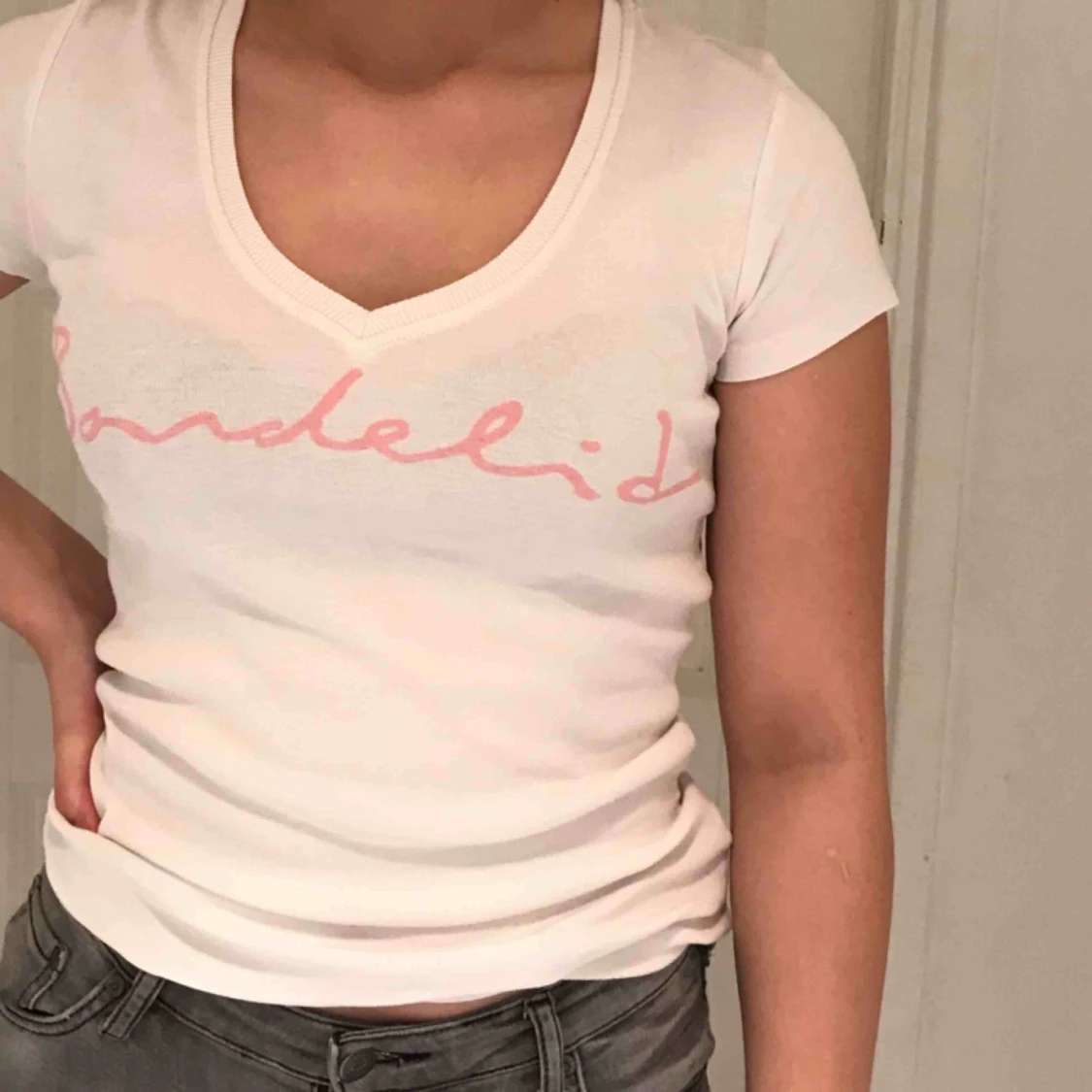 Vit bondelid tröja med rosa text v-ringad jättesnygg använd max 4 gånger!! Köparen står för frakten 59kr