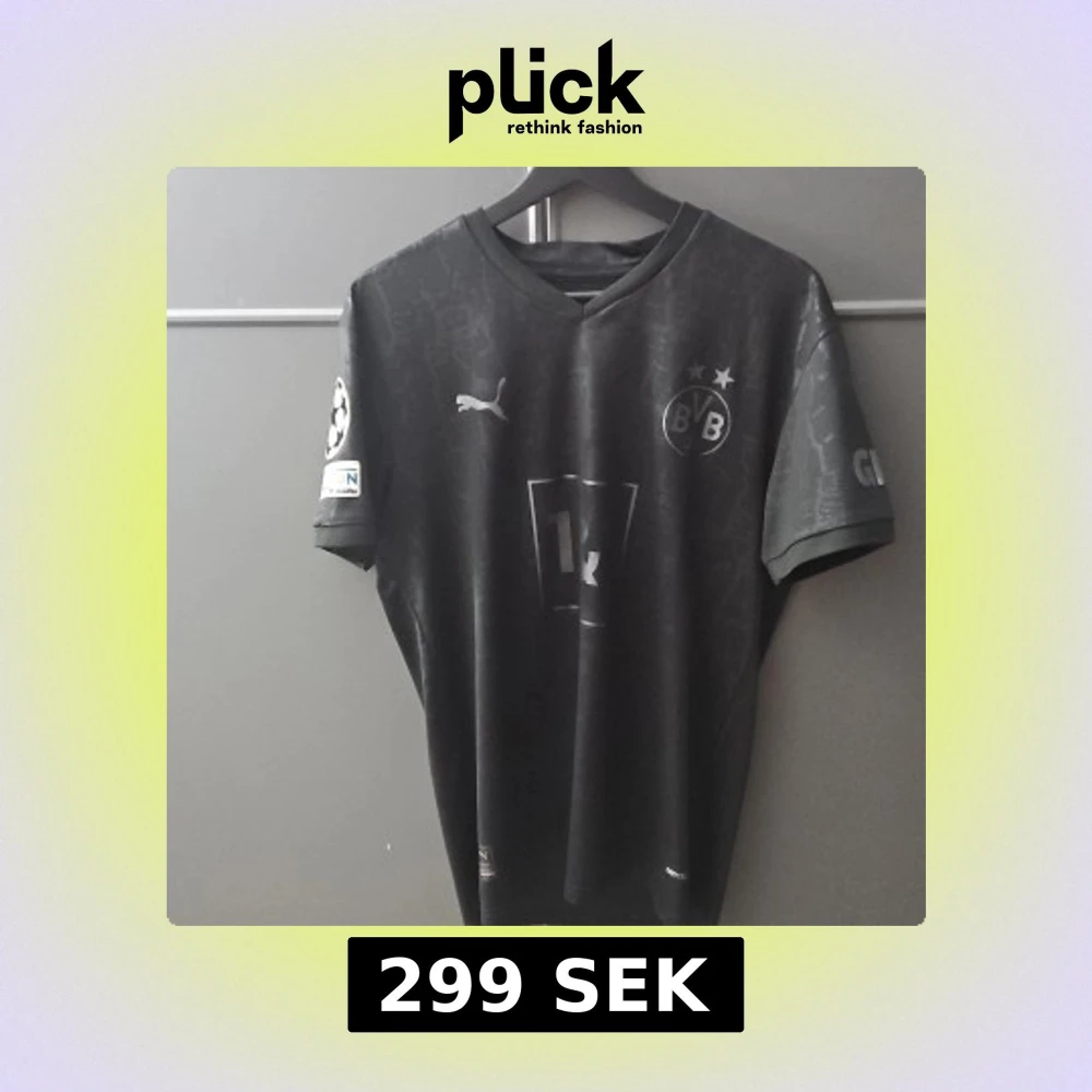 Säljer en svart Borussia Dortmund fotbollströja med Reus 11 på ryggen. Tröjan har korta ärmar, BVB-logga, Puma-logga och Champions League-märke på ärmen. Snygga detaljer och tryck i vitt och grått. Priset går att prata om:)