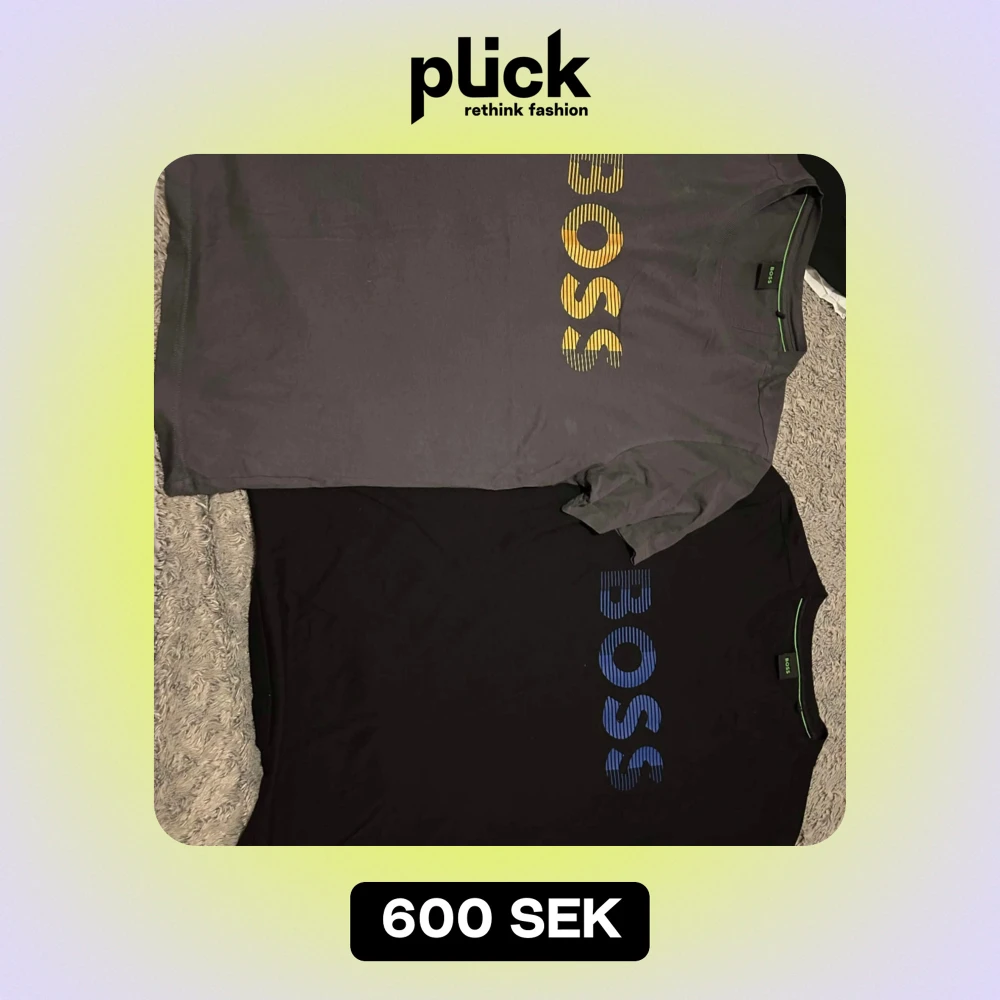 Två snygga t-shirts från Boss i olika färger. Den ena är grå med gult tryck och den andra är svart med blått tryck. Perfekta för en casual look och passar till både jeans och shorts. De har en normal passform och är kortärmade, vilket gör dem perfekta för sommaren.