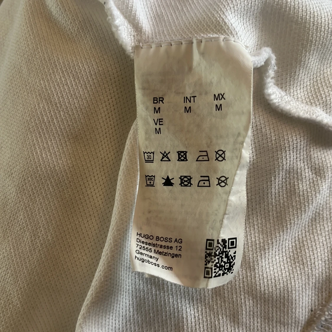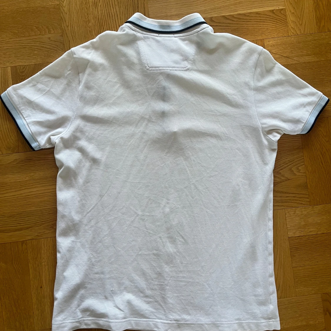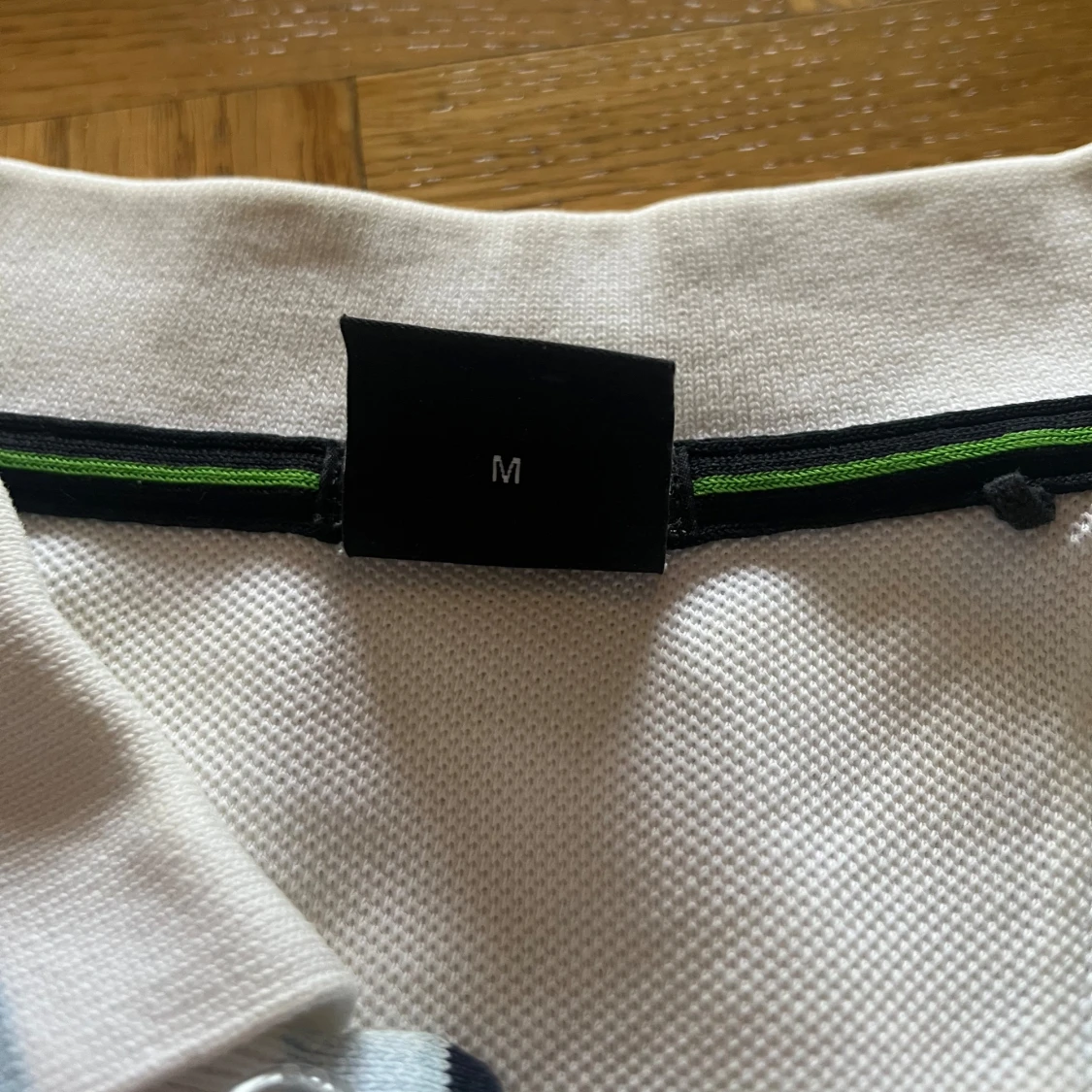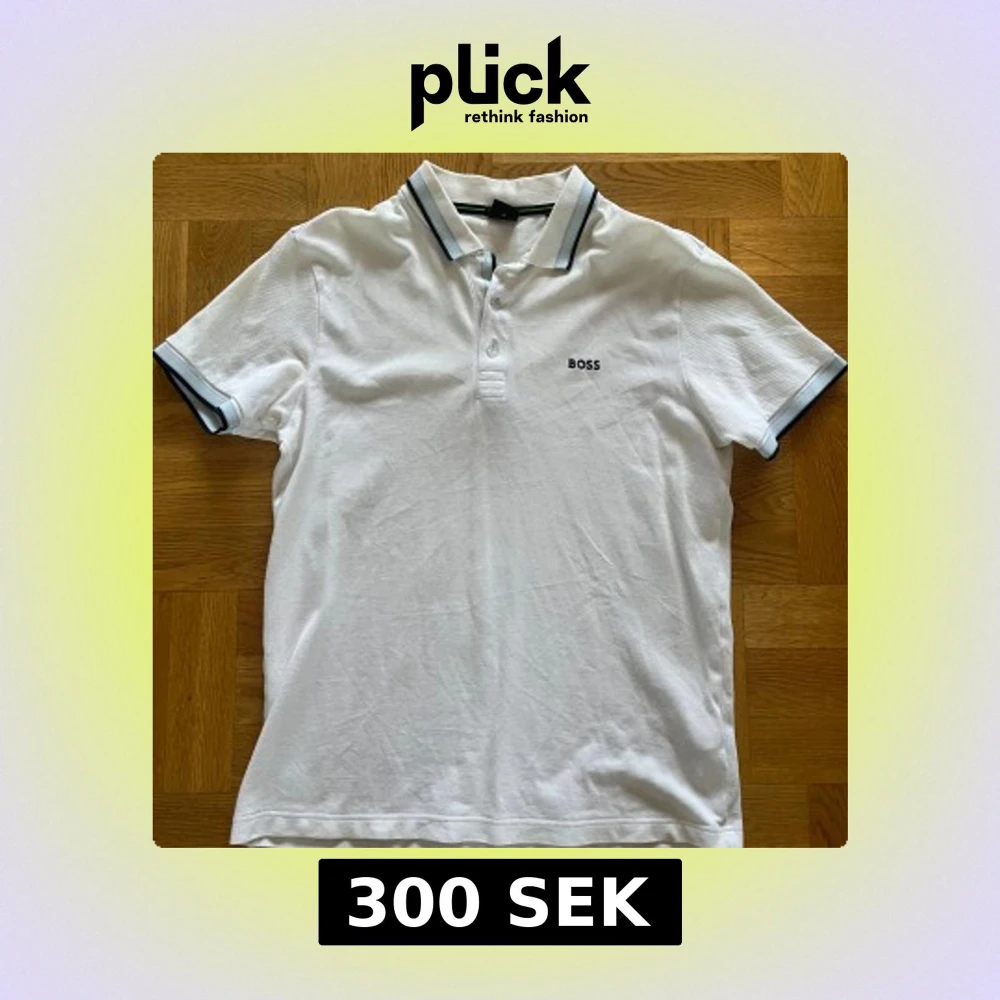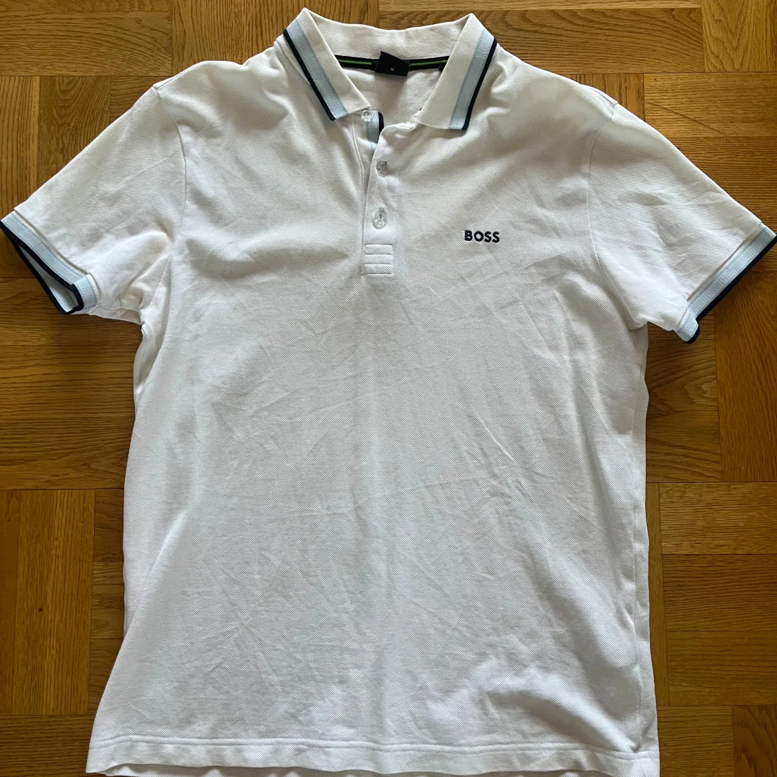 Säljer en stilren vit pikétröja från Boss med korta ärmar och klassisk krage. Tröjan har diskreta svarta och grå detaljer på kragen och ärmsluten samt en broderad logotyp på bröstet. Perfekt för en avslappnad men ändå snygg look. Använd endast ett fåtal gånger. Stl M