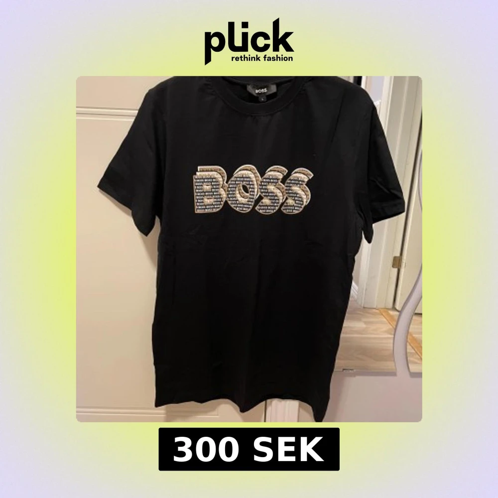 Svart t-shirt från BOSS med stor, broderad logga framtill i vitt och beige. Klassisk passform med rund hals och korta ärmar. Perfekt för dig som gillar stilrena plagg med tydlig branding.