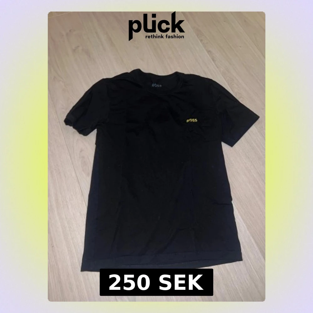 Säljer en svart t-shirt från BOSS med gul logotyp på bröstet.
