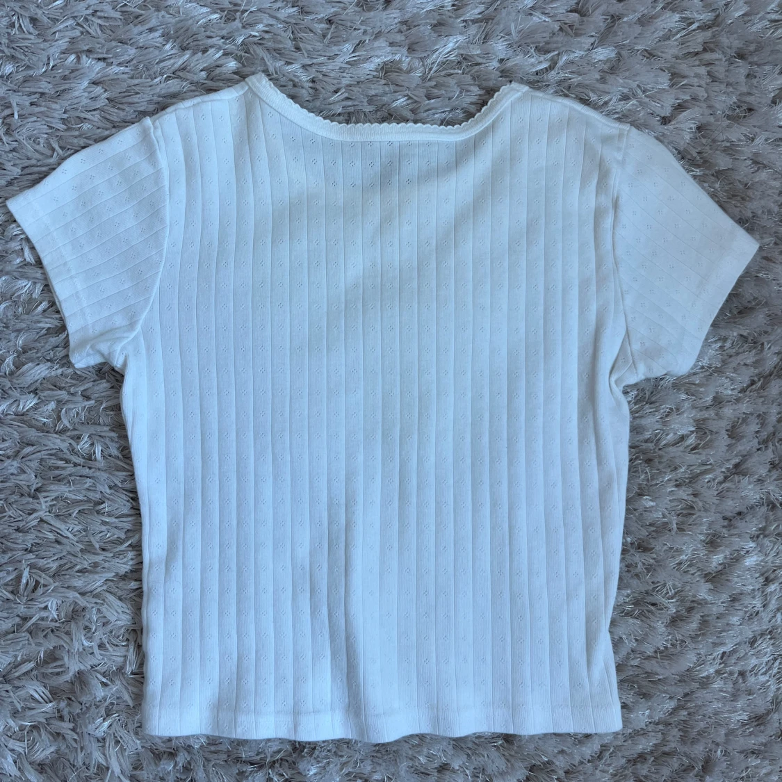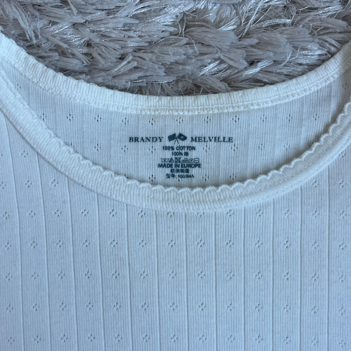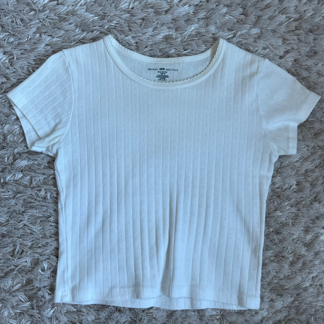 jättesöt vit t-shirt från brandy melville med fina detaljer! Storleken är one size men passar mig som bär S. Stretchigt och mjukt material och har används fåtal gånger. skriv vid frågor eller funderingar💕💕