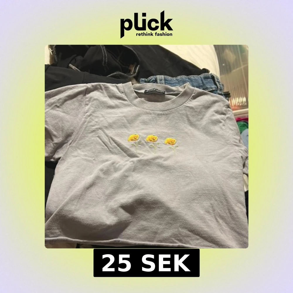 Säljer en ljusgrå t-shirt från Brandy Melville med korta ärmar och tre små broderade gula blommor på bröstet. T-shirten har en klassisk rund hals och är gjord i mjuk bomull. Perfekt för dig som gillar söta detaljer och enkel stil.