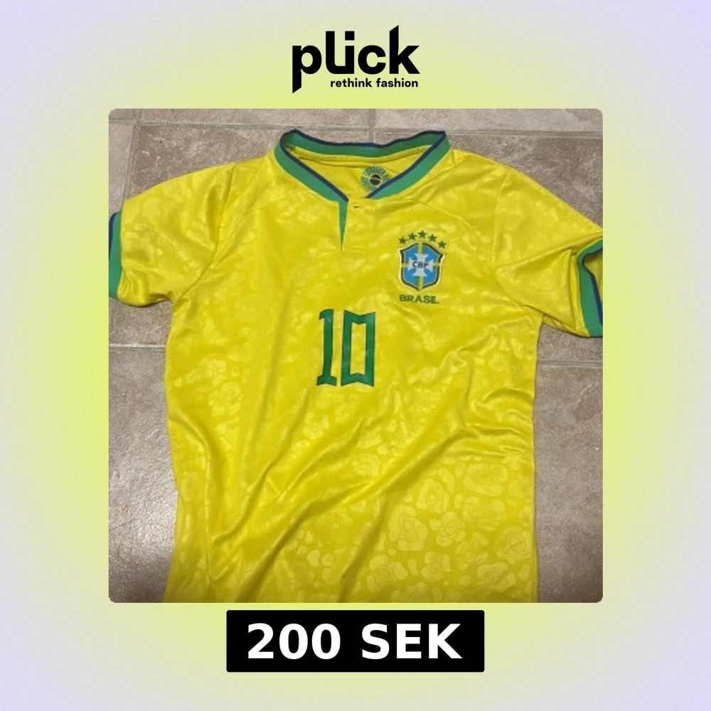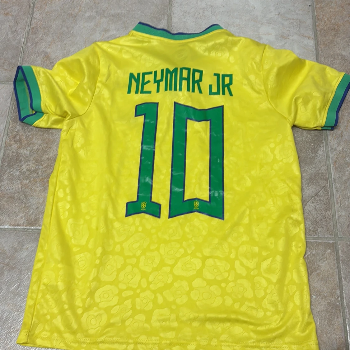 Gul Brasilien fotbollströja från Nike med gröna detaljer, Neymar Jr och nummer 10 på ryggen. Tröjan har korta ärmar, CBF-emblem på bröstet och subtilt mönster i tyget. Perfekt för dig som älskar fotboll och vill sticka ut på läktaren eller planen.