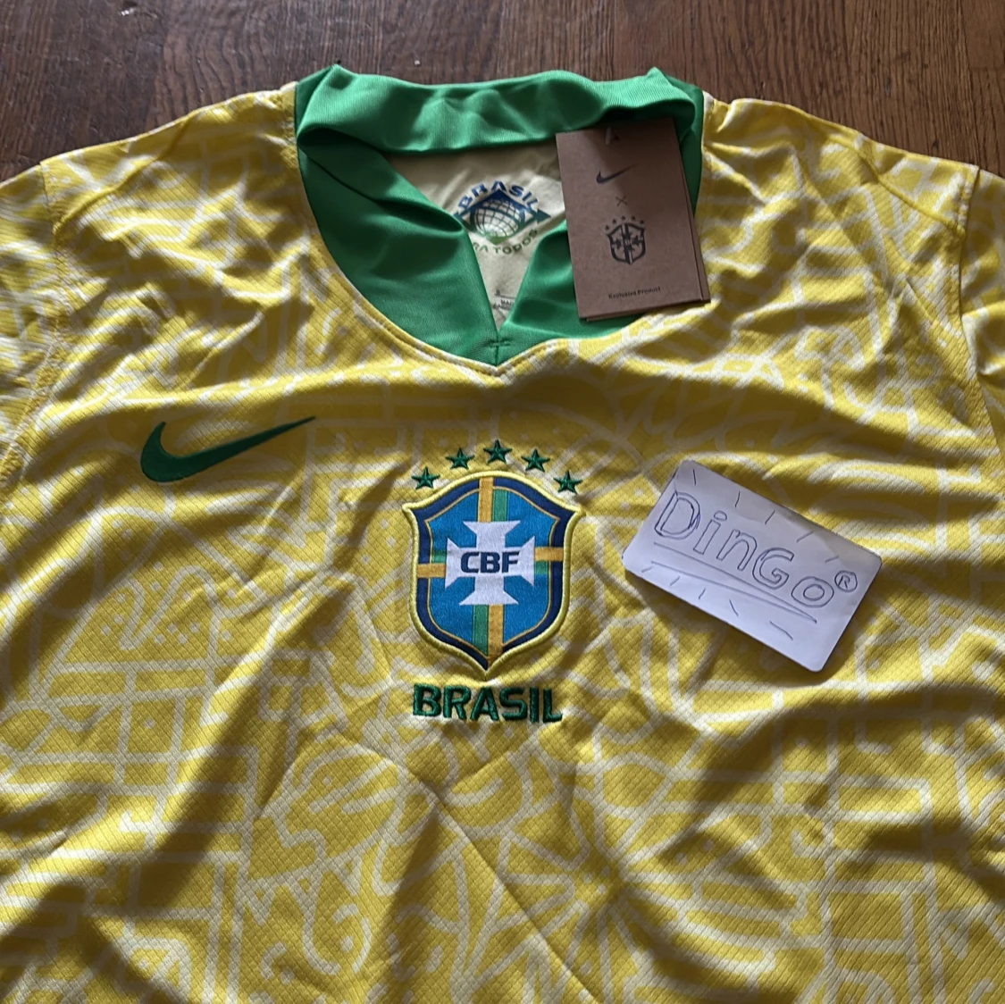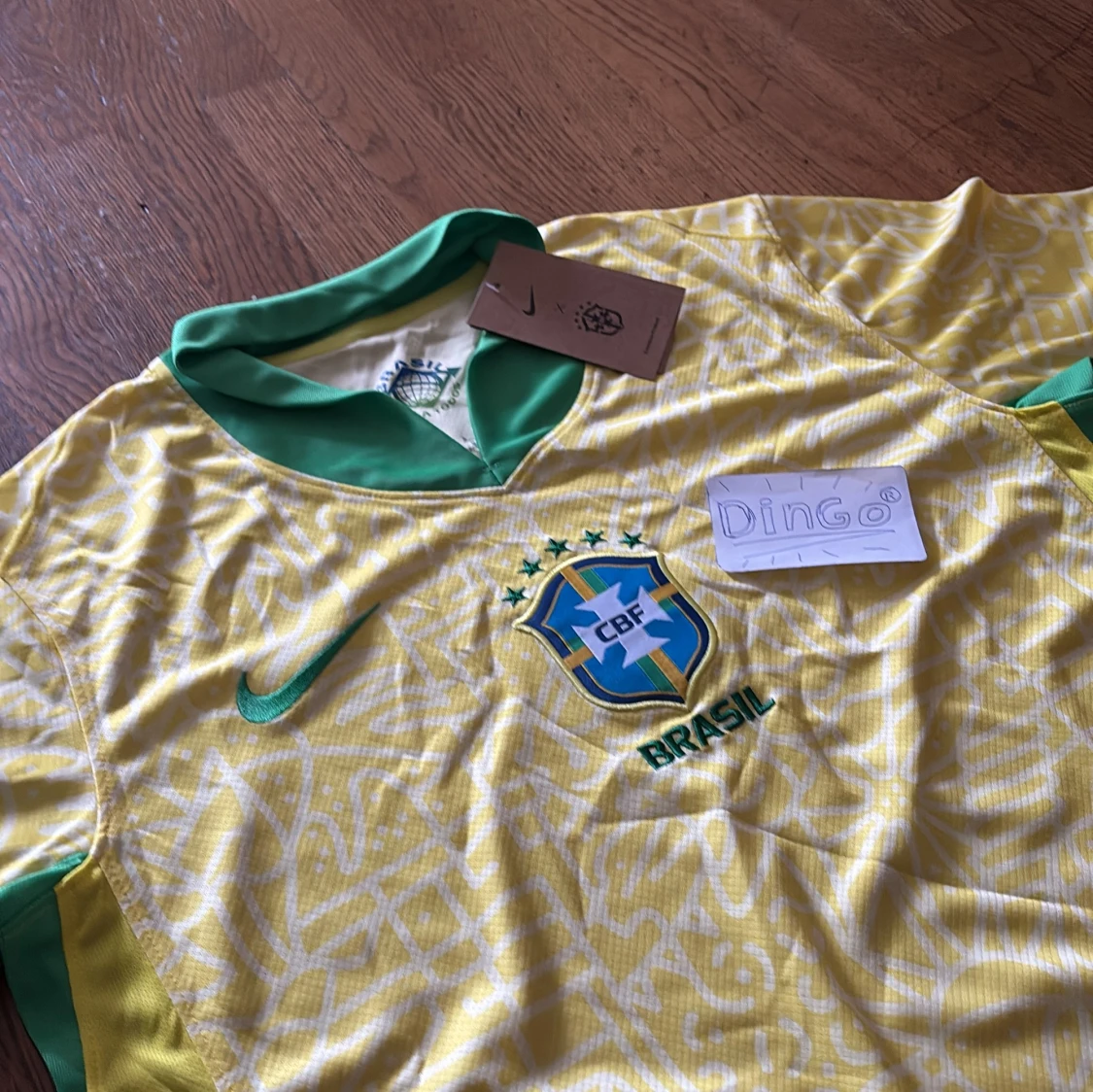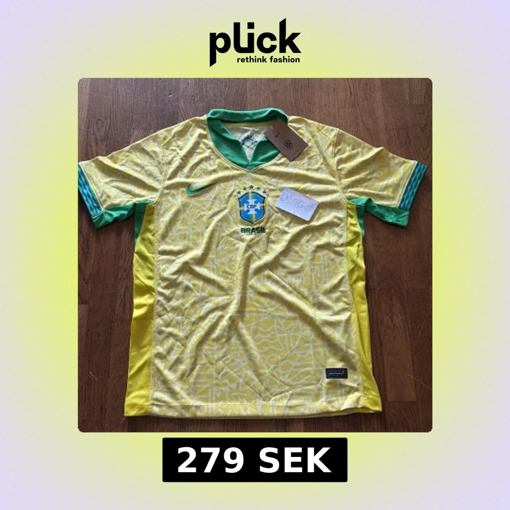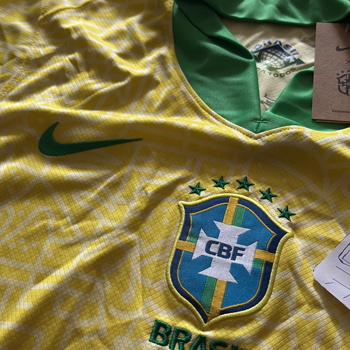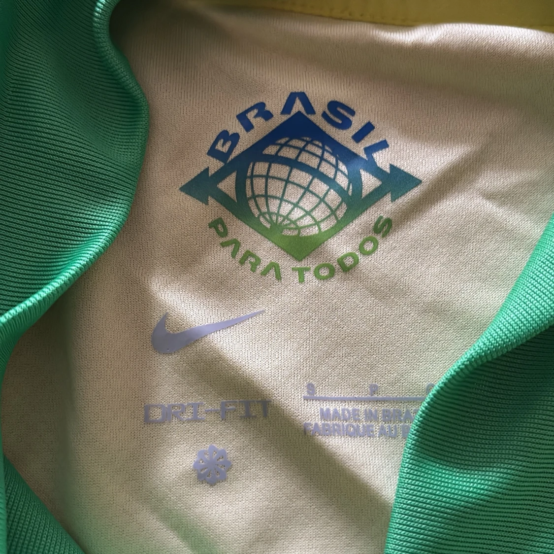 Snygg Brasilien fotbollströja från Nike med gul bas och gröna detaljer på krage och ärmslut. Tröjan har ett grafiskt mönster, broderat CBF-emblem och Nike-logga på bröstet. Tillverkad i Dri-Fit material som andas, perfekt för match eller träning.