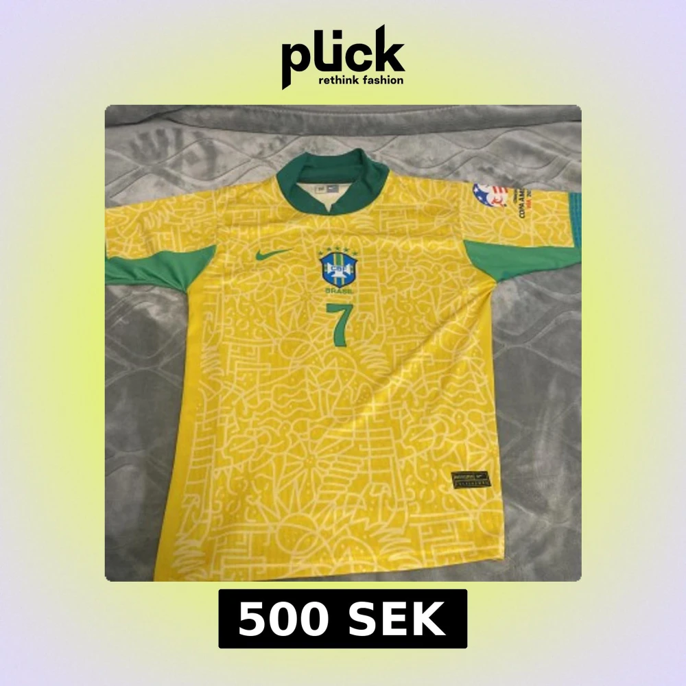 Snygg Brasilien fotbollströja från Nike i storlek M. Tröjan är gul med gröna detaljer, har ett abstrakt mönster och nummer 7 på både fram- och baksidan samt namnet Juliano. Klassisk krage och korta ärmar. Perfekt för dig som älskar fotboll och vill sticka ut.