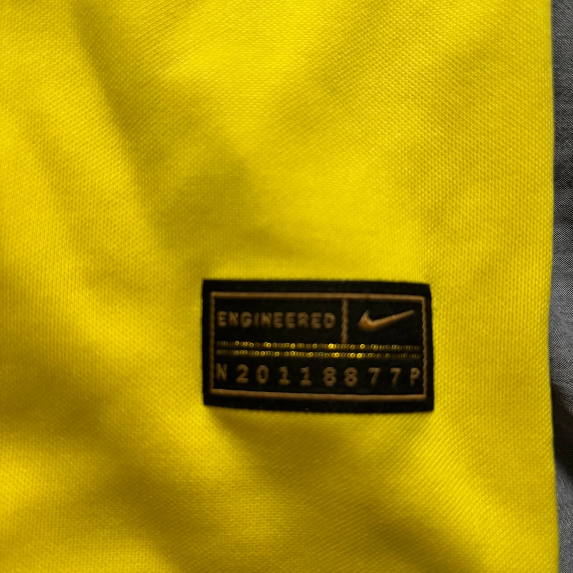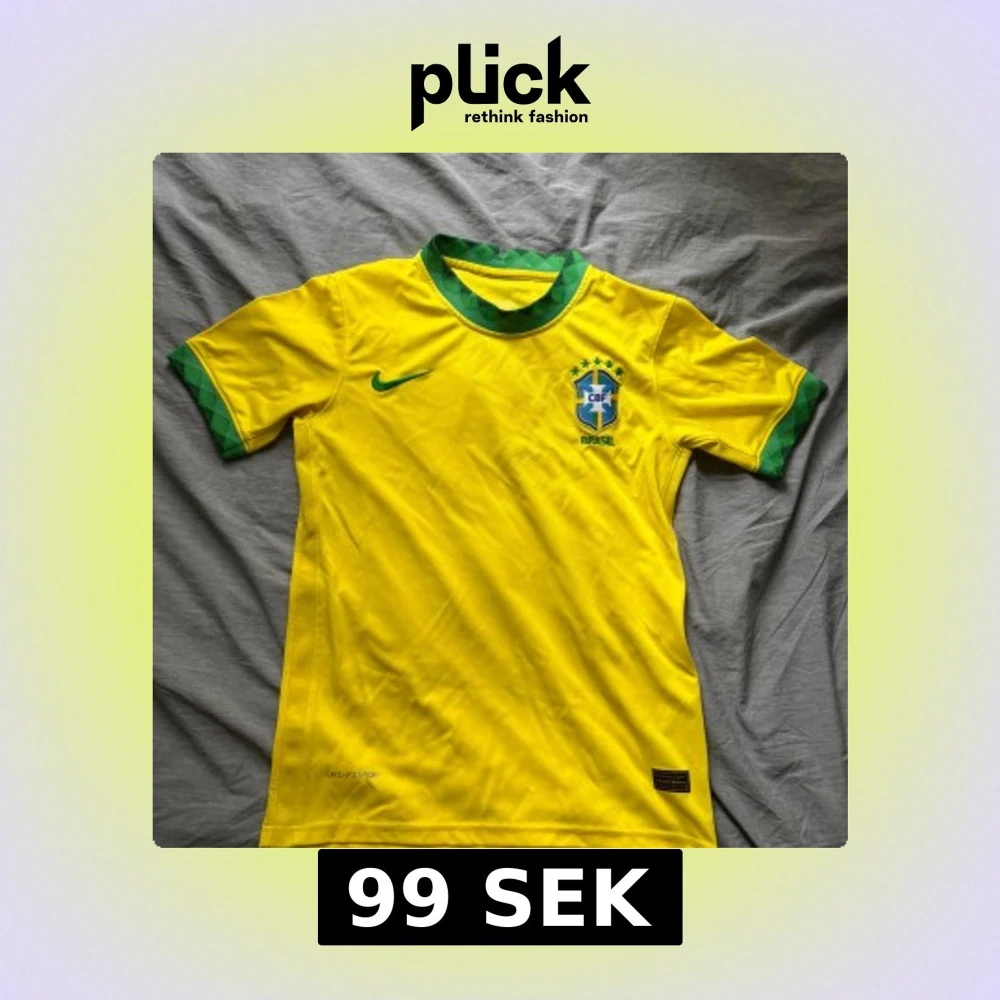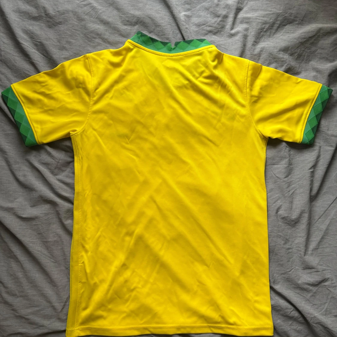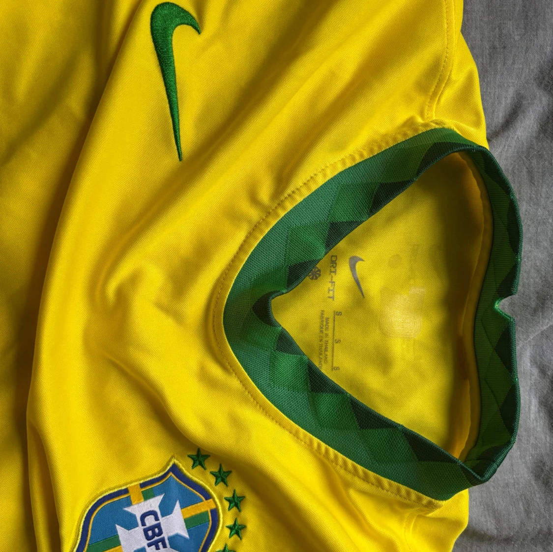 Säljer en fotbollströja ”Brasilien” hemmakit från Nike i gult med gröna detaljer. Tillverkad i lätt och ventilerande Dri-FIT-material. Landslagströjan passar både S/M