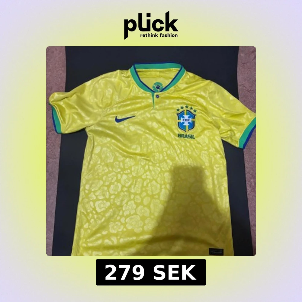 Gul Brasilien fotbollströja från Nike med blått Swoosh, gröna och blå detaljer på krage och ärmslut. CBF-emblem på bröstet och subtilt mönster i tyget. Tillverkad i Dri-FIT-material som andas och känns lätt mot kroppen.