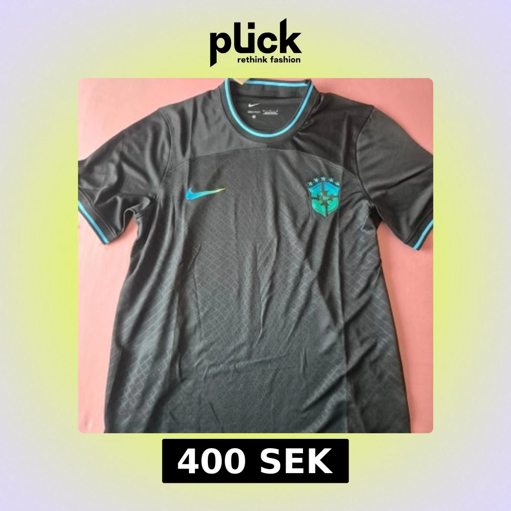 Snygg svart Brasilien fotbollströja från Nike med blå detaljer och CBF-emblem på bröstet. Tröjan har korta ärmar, rund hals med blå kant och är gjord i lätt Dri-FIT material som andas. Diskret geometriskt mönster på framsidan och blå Nike-logga.