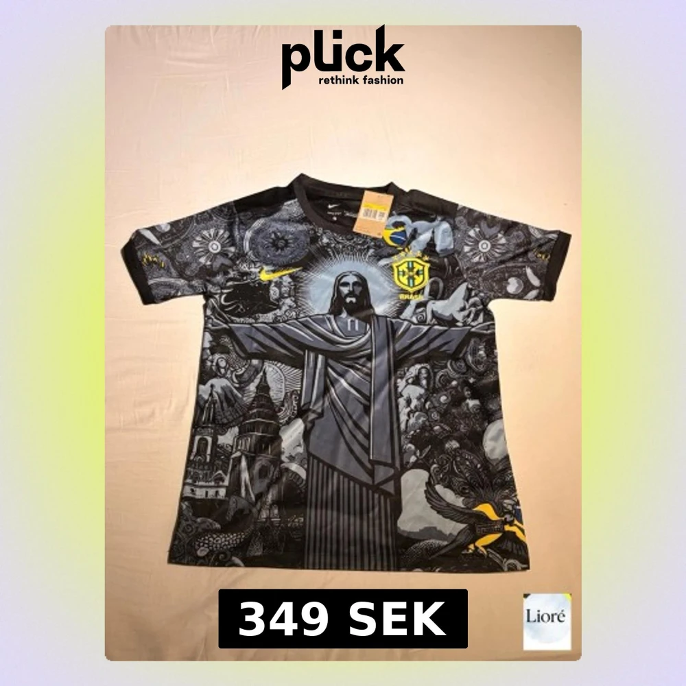 Snygg svart t-shirt från Nike med Brasil-logga och gult tryck. Framsidan har ett stort grafiskt motiv med Kristusstatyn och detaljer i grått och gult. Korta ärmar med mönster och rund hals. Perfekt för dig som gillar unika fotbollströjor och streetstyle.